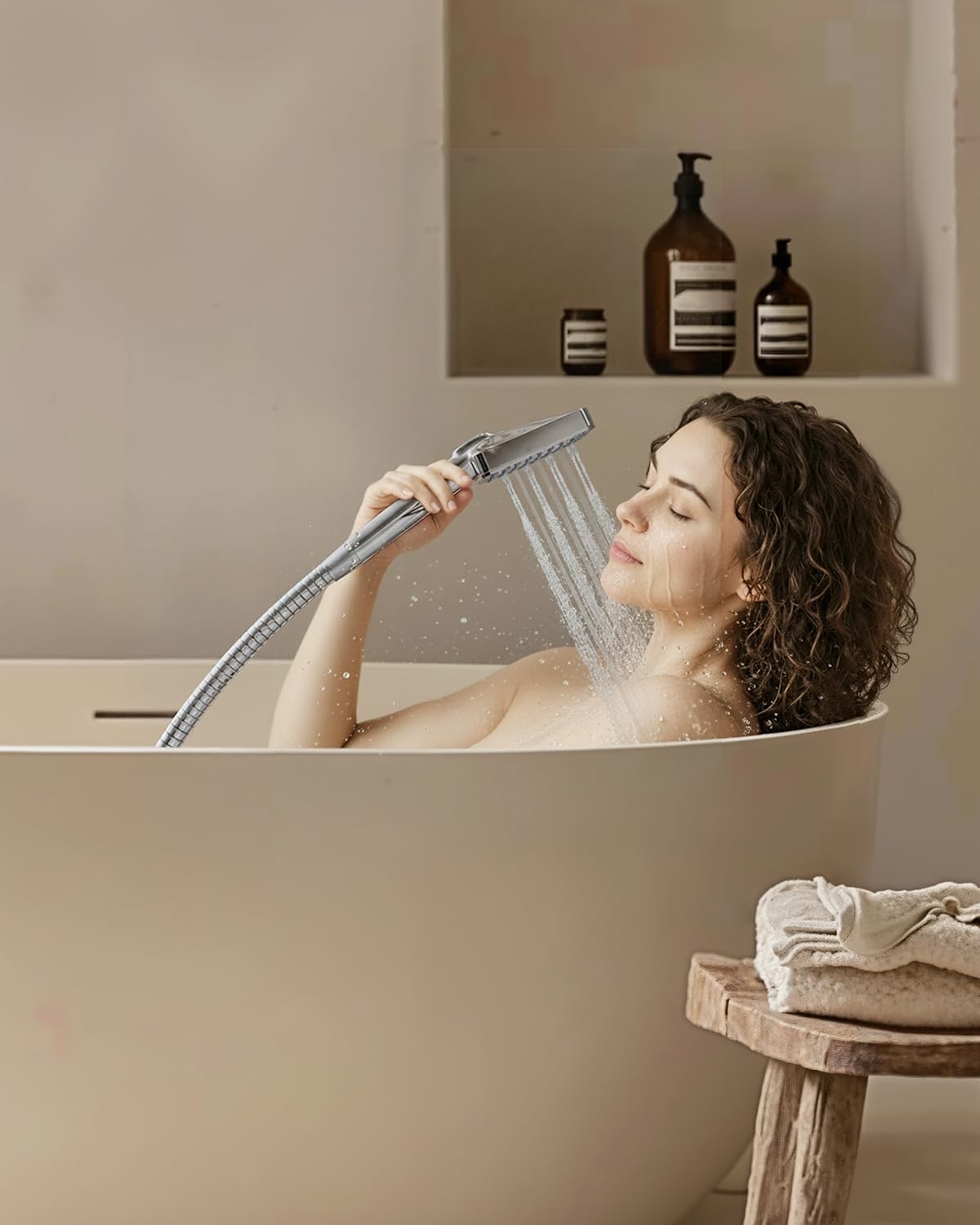 • 6 функции за пръскане: душовата глава с филтър има 6 вида струи: дъжд, масаж, мощна струя, окислителна струя и режим на смесване. Чрез завъртане на лопатката на душовия панел можете лесно да превключвате между различните режими, които желаете. Идеална за ежедневно миене на коса, нежен душ, масажиране, къпане на деца или домашни любимци, почистване на баня и други.
