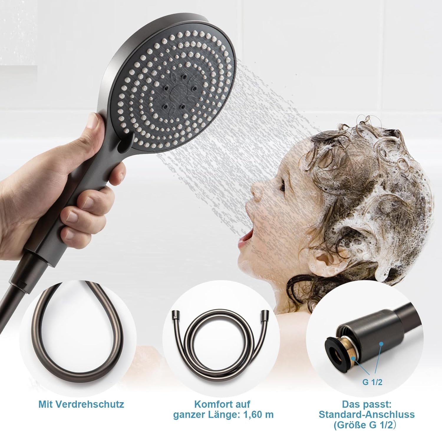 Душ слушалка OFFO с маркуч 1.6 м, Душ слушалка с маркуч със защита от усукване, Голяма душ слушалка с 6 вида струи, Водоспестяваща душ слушалка, Ръчна душ слушалка за къпане, Матиран черен хром