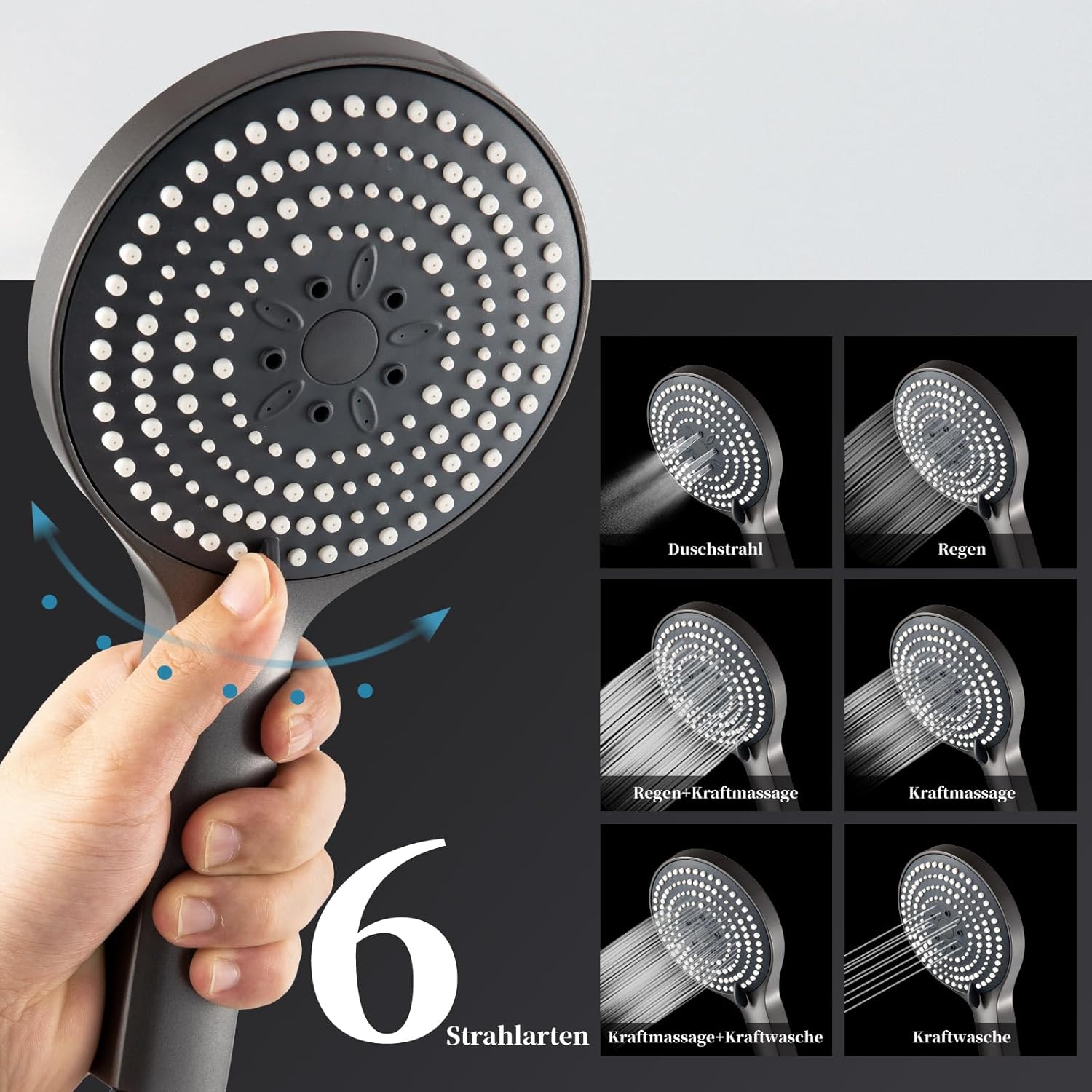 • Душова глава с 6 вида струи: душовата глава е с 6 вида струи. Можете да превключвате режимите с едно докосване. Всеки режим ви предлага прекрасно изживяване под душа.
