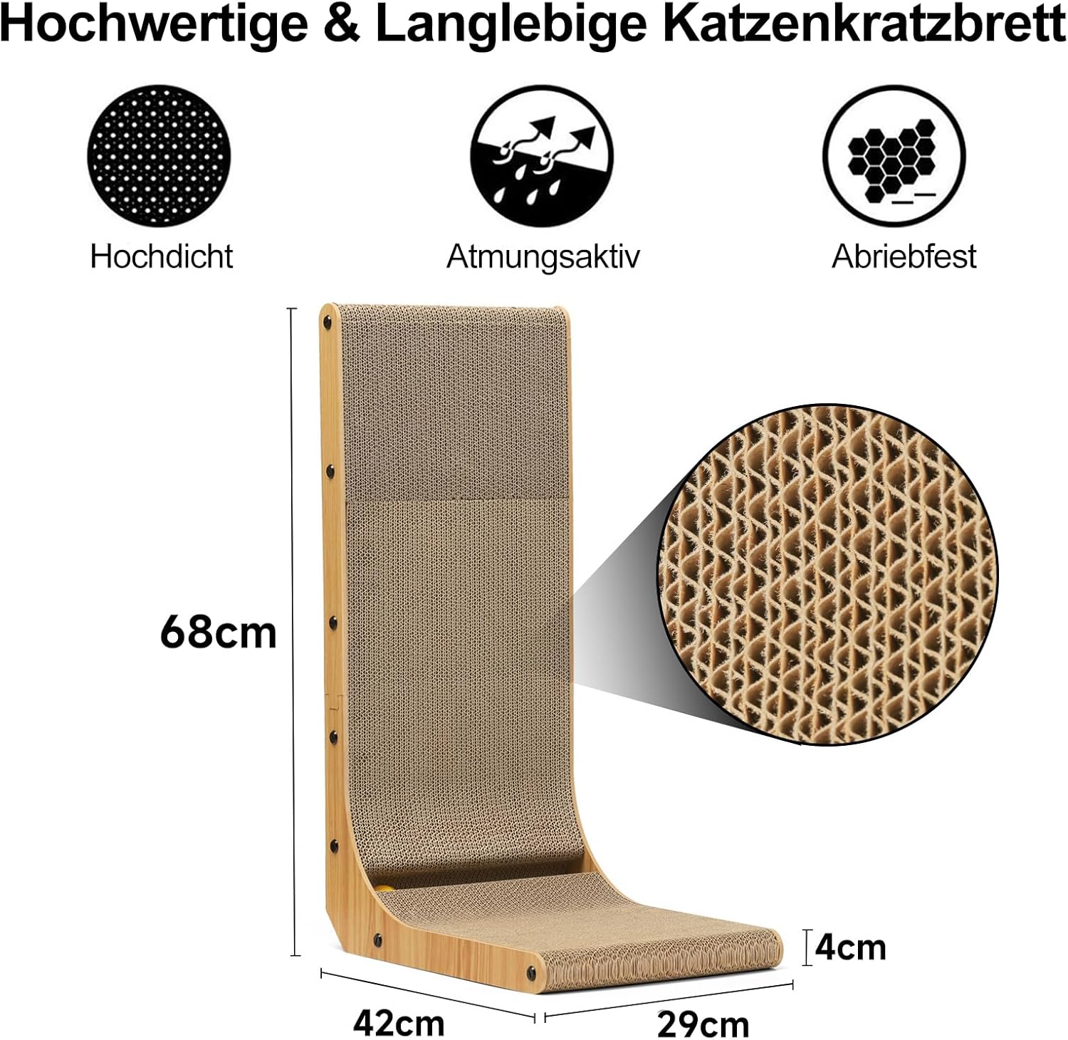 Дъска за драскане за котки FUKUMARU, висока 68 см, L-образна, за котки, издръжлива дъска за драскане за котки с играчка топка, мебели за драскане за котки, изработени от висококачествен картон, за стена и ъгли, L