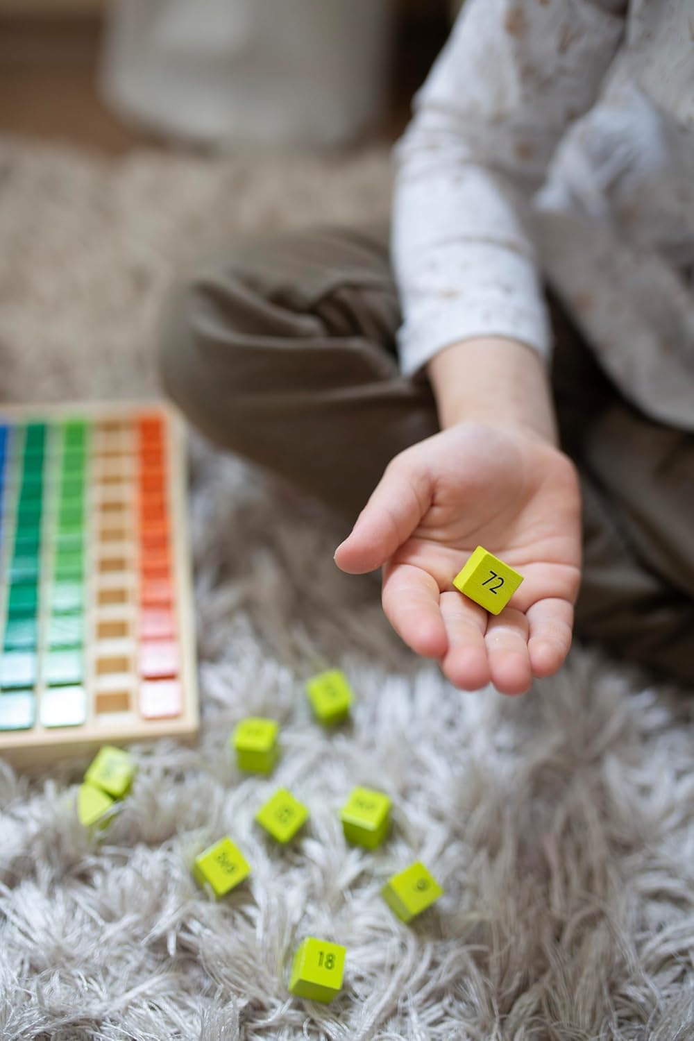 • Децата могат да използват дървени строителни блокчета Монтесори, за да развият увереност в разбирането си за числата, което прави математическите задачи по-лесни и по-приятни. С тази учебна играчка децата учат цветове, форми, правилния ред на числата в десетичната система и много други. Подходяща е за деца от начално училище, първи клас, начално училище, предучилищна възраст, детска градина и деца над 36 месеца.