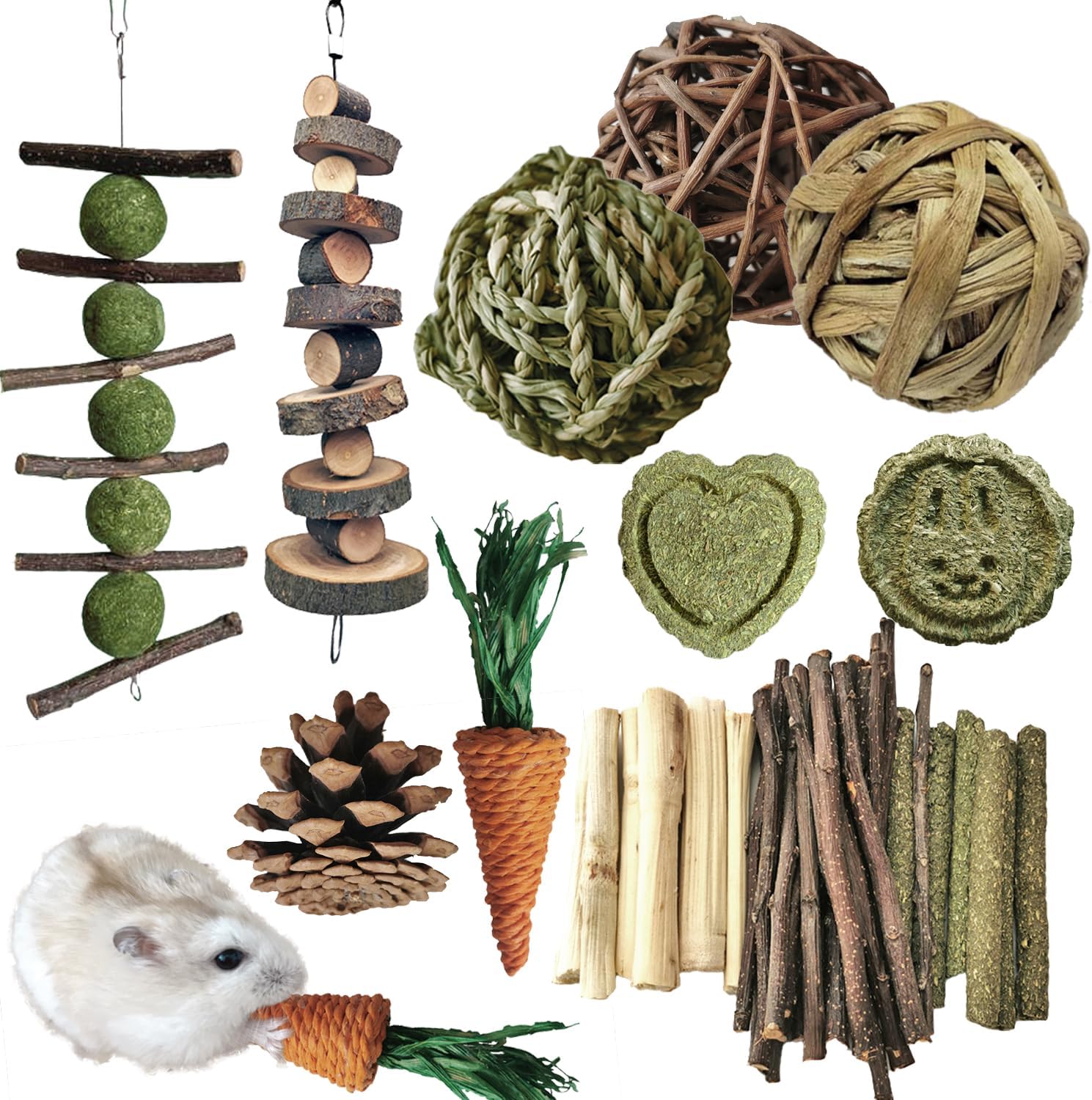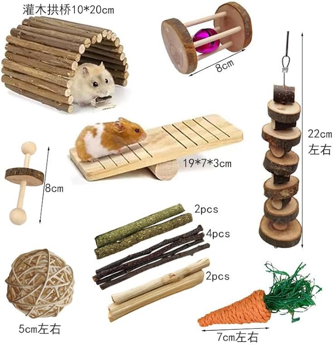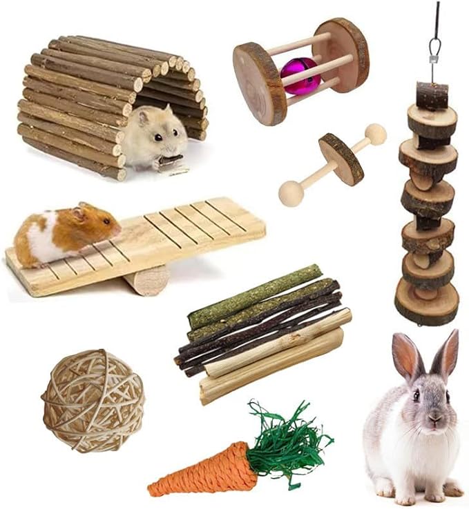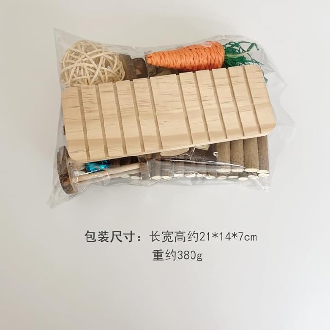 • Комплектът от естествени аксесоари за зайци е подходящ за малки гризачи като морски свинчета, зайци, чинчили, хамстери, плъхове и джербили. Той им помага да отхапват постоянно растящите си зъби и предпазва домашните любимци от гризане на клетката и другите мебели. Перфектният аксесоар за клетката на вашия прекрасен домашен любимец.