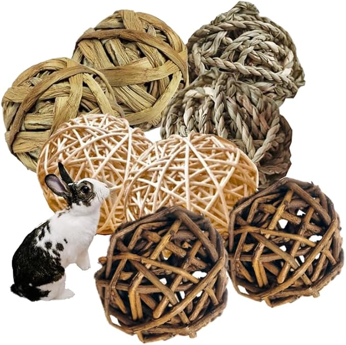 • Играчките за зайци са добре изработени и устойчиви на ухапване. Ръчно изработените плетени топки (без лепило, без добавки, без метал) са идеални за игра и гризане, както и за играчки за търсене на храна, в които можете да слагате лакомства. Широка гама от малки играчки за вашите малки приятели.