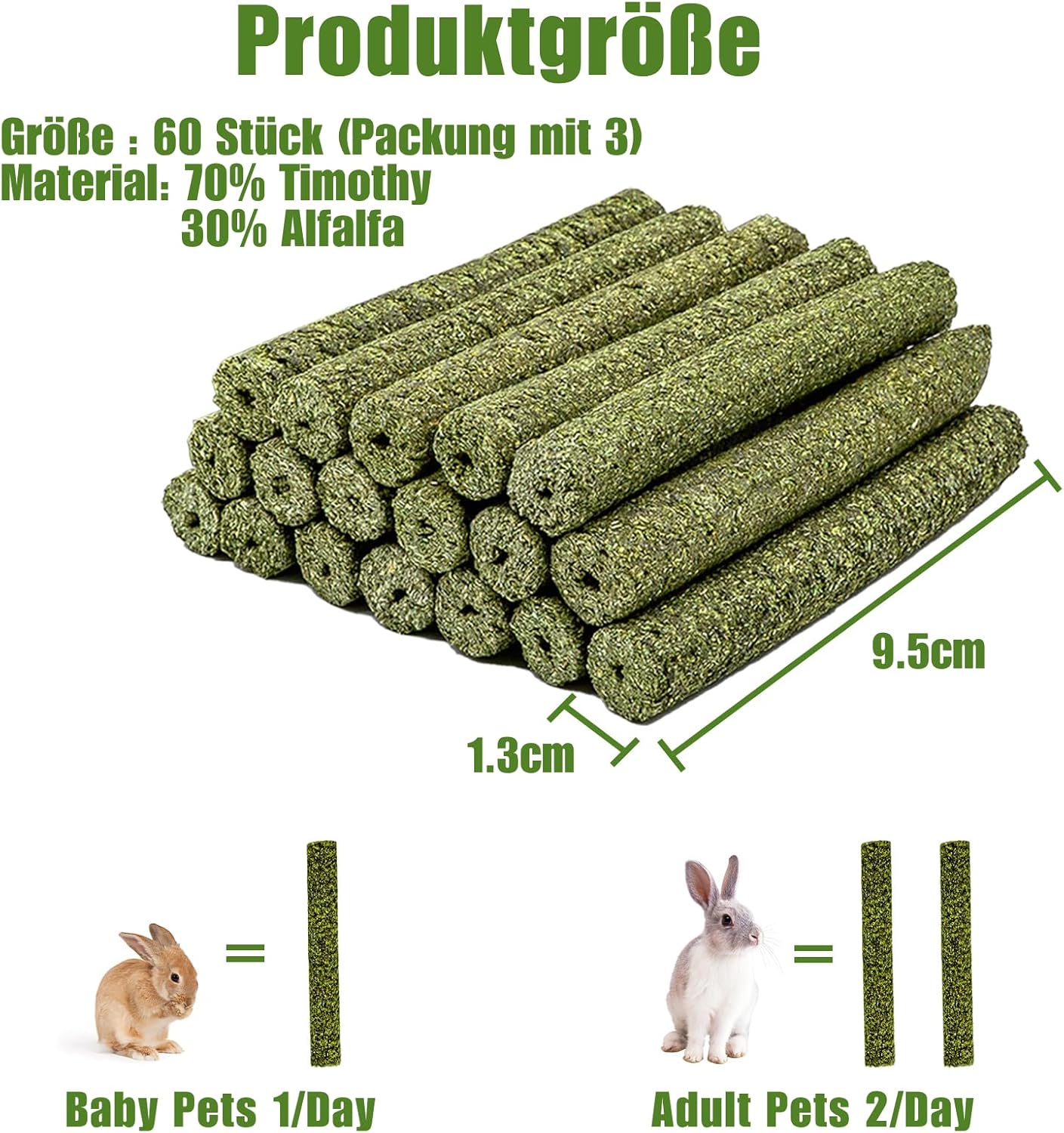 Дъвчаща играчка за зайци, Лакомства за зайци, Натурални пръчици от сено за тимотей, Пребори скуката за зайци, чинчили, морски свинчета, хамстери (опаковка от 60)