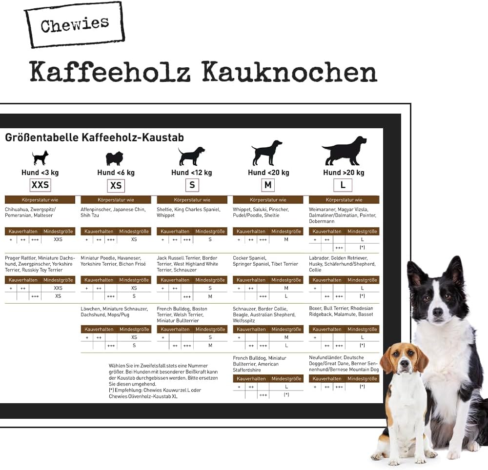 • Подходяща за всяко куче: нашата кокал за кучета от кафеено дърво се предлага в три размера. Размер M препоръчва Chewies за средни породи кучета с телесно тегло до 20 кг.