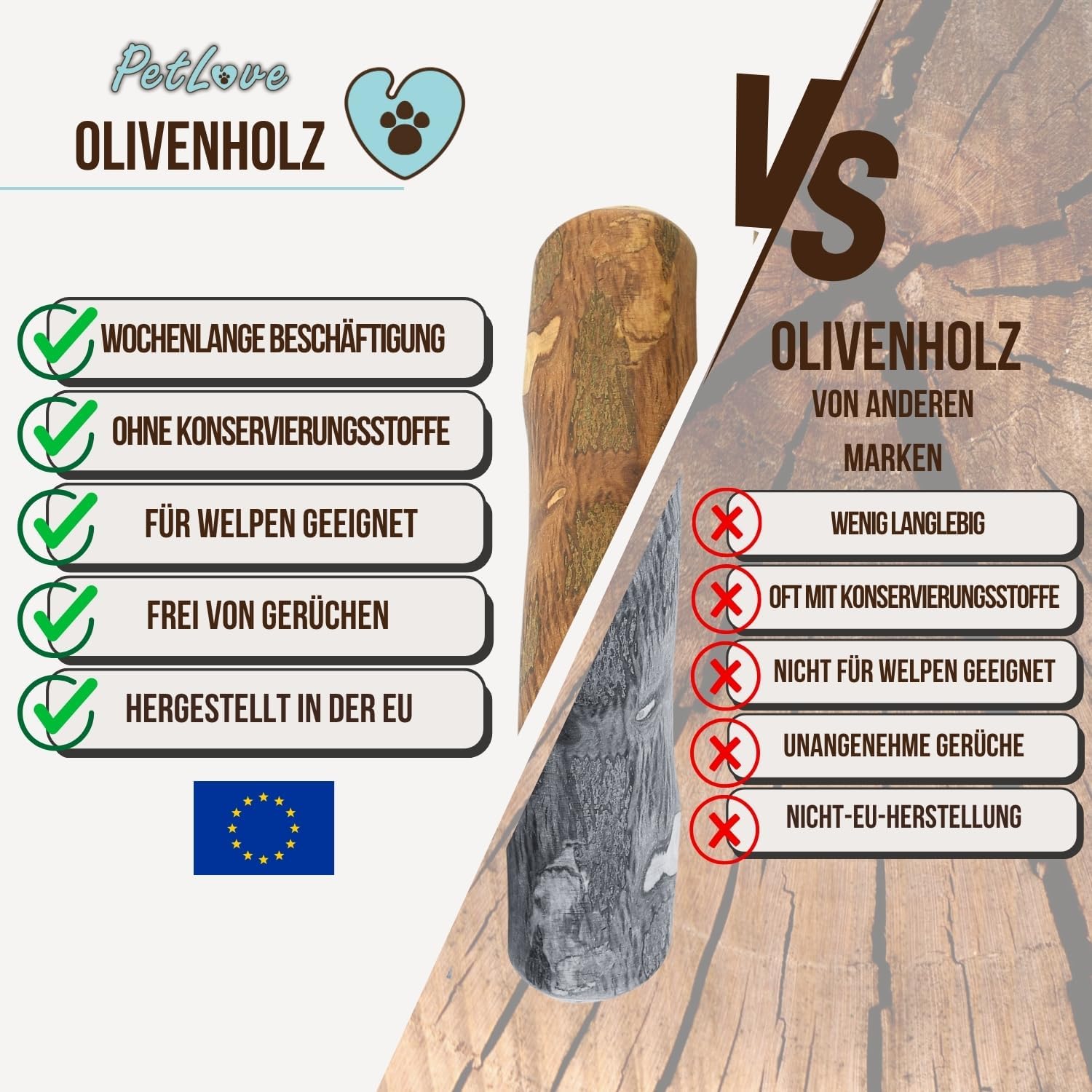 • Максимално забавление при дъвчене с пръчката от маслиново дърво PetLove: Нашата пръчка за дъвчене от маслиново дърво за кучета е шлайфана и полирана по краищата след рязане, така че няма абсолютно никакъв риск от нараняване. След това дървото е импрегнирано с висококачествено зехтин.
