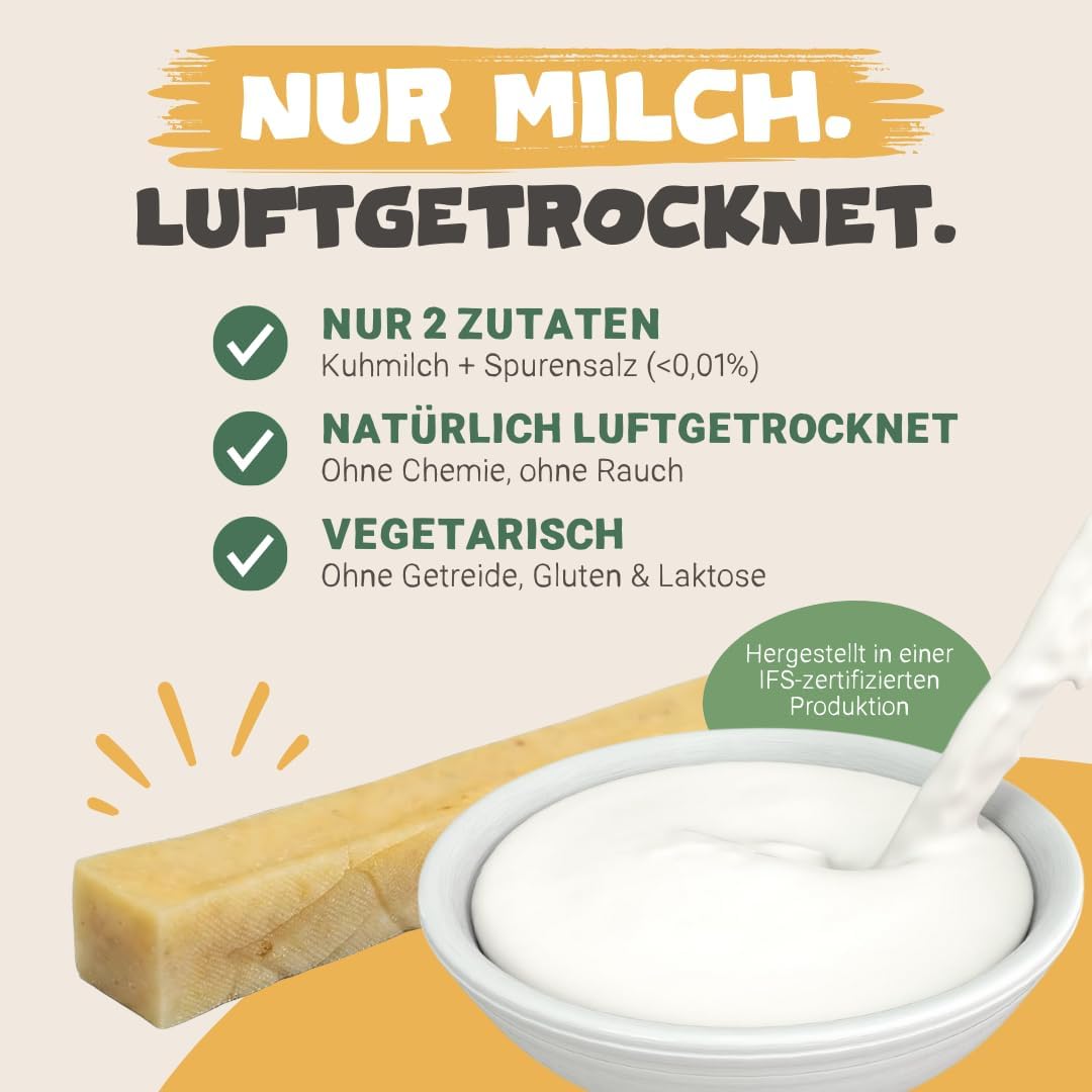 • IFS СЕРТИФИЦИРАНА ДЪВЧАЩА КУЧЕШКА ЗА ЗЪБИ: Храненето на вашия домашен любимец е важно за нас, поради което нашите продукти за домашни любимци отговарят на най-строгите индустриални стандарти и насоки. Нашата дъвчаща храна за кучета с мляко як е вегетарианска, без глутен и не съдържа химикали или изкуствени консерванти.