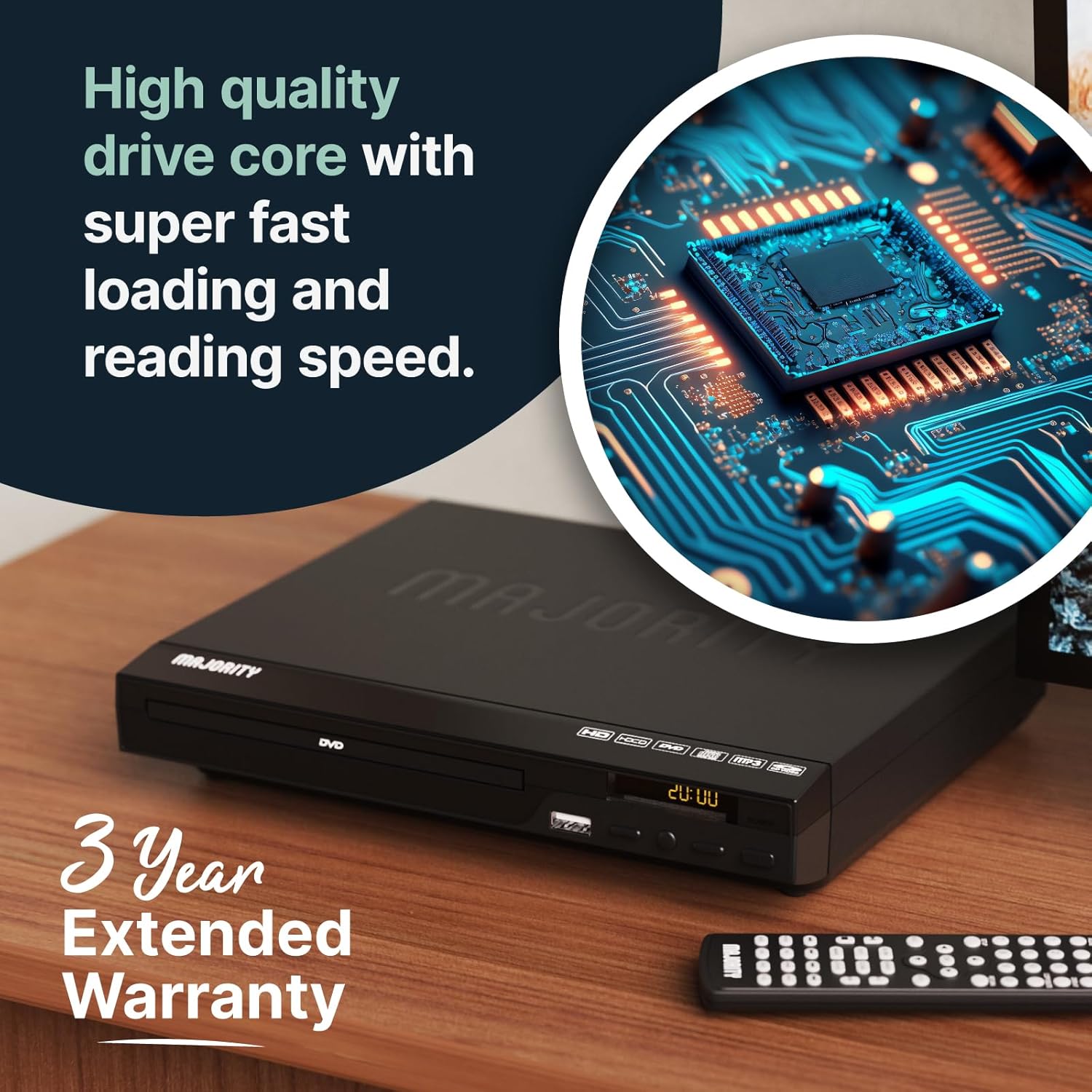 DVD плейър MAJORITY | Мини DVD плейър, компактен, без регионални ограничения за телевизор/телевизор | 1080p мащабиране, възпроизвеждане от USB и CD | С HDMI кабел и дистанционно управление