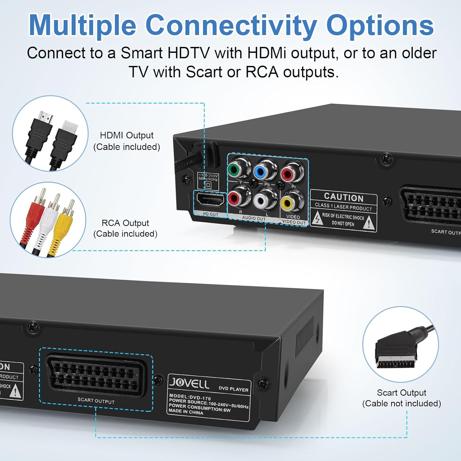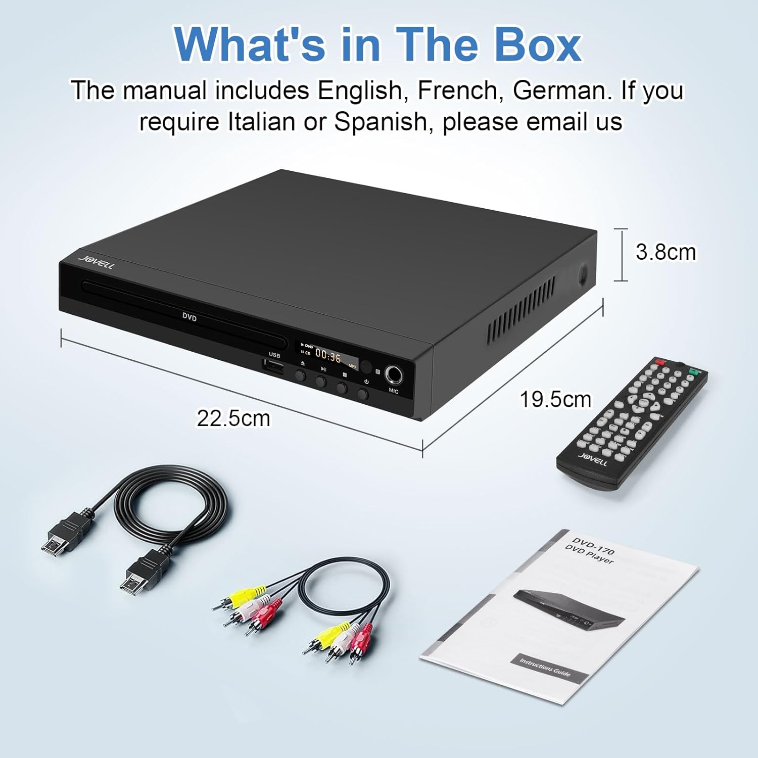 • 【Гаранция и опаковка】18 месеца гаранция и 24-часова приятелска поддръжка на клиенти. Съдържание на кутията: 1 x DVD-170 DVD плейър с метален корпус и SCART (без поддръжка на Blu-ray), 1 x дистанционно управление с пълна функция (без батерия), 1 x HDMI кабел, 1 x RCA кабел, 1 x ръководство за потребителя (английски, немски, френски).