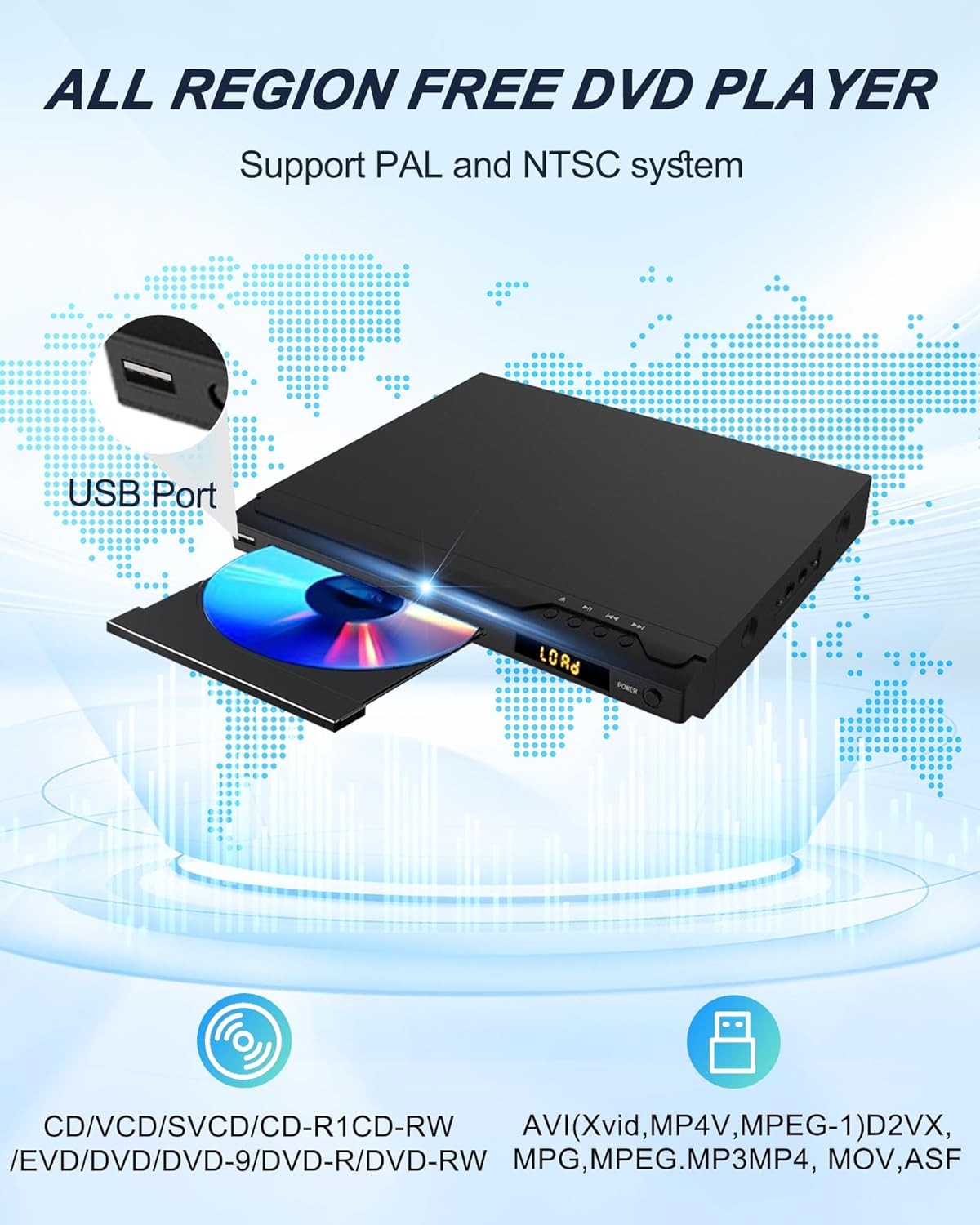 • Няма регионални ограничения: С Home All Regions Free DVD Player можете да възпроизвеждате DVD-та от всички региони и държави, защото поддържа разнообразни формати, включително DVD/DVD-9/DVD-R/DVD-RW/CD/VCD/SVCD/CD-R/CD-RW/EVD/[с изключение на Blu-ray]. USB входът ви позволява да възпроизвеждате медийни файлове от вашето USB устройство и лесно да се свързвате с вашия музикален достъп. Можете също да използвате функцията за копиране от USB, за да прехвърляте файлове от диск на USB устройство. Този универсален DVD плейър разширява възможностите ви за забавление и ви предлага гъвкавост и удобство за приятно гледане.