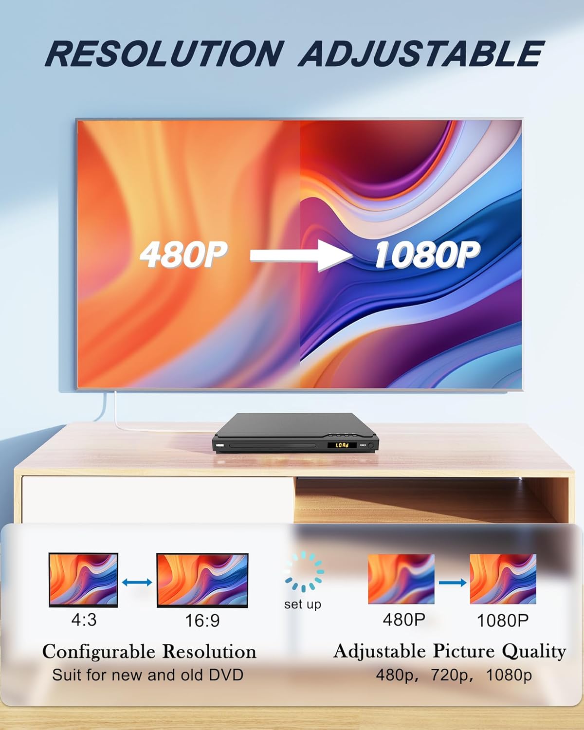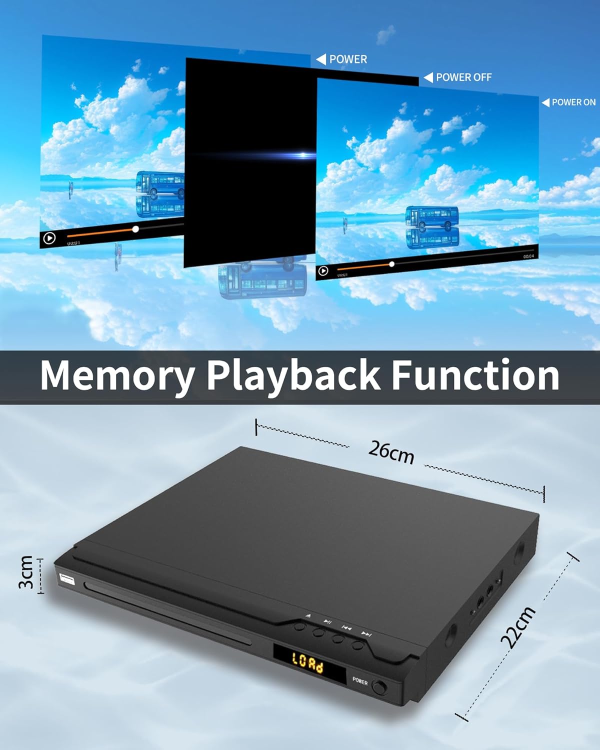 • Компактен дизайн: нашият DVD плейър за телевизор с размери 26 x 22 x 3 см се отличава с тънък и лек дизайн, спестява място и може лесно да се постави навсякъде в дома ви. Теглото от 1 кг го прави лесен за преместване. Благодарение на тънкия дизайн, DVD плейърът за телевизор може да се постави хоризонтално на стойка за телевизор или вертикално в тесни пространства, като по този начин се адаптира гъвкаво към различни пространствени условия. Елегантният му дизайн гарантира, че се вписва безпроблемно във всяка стая. Практичен за модерни жилищни пространства, той съчетава стил и функционалност в един елегантен корпус.