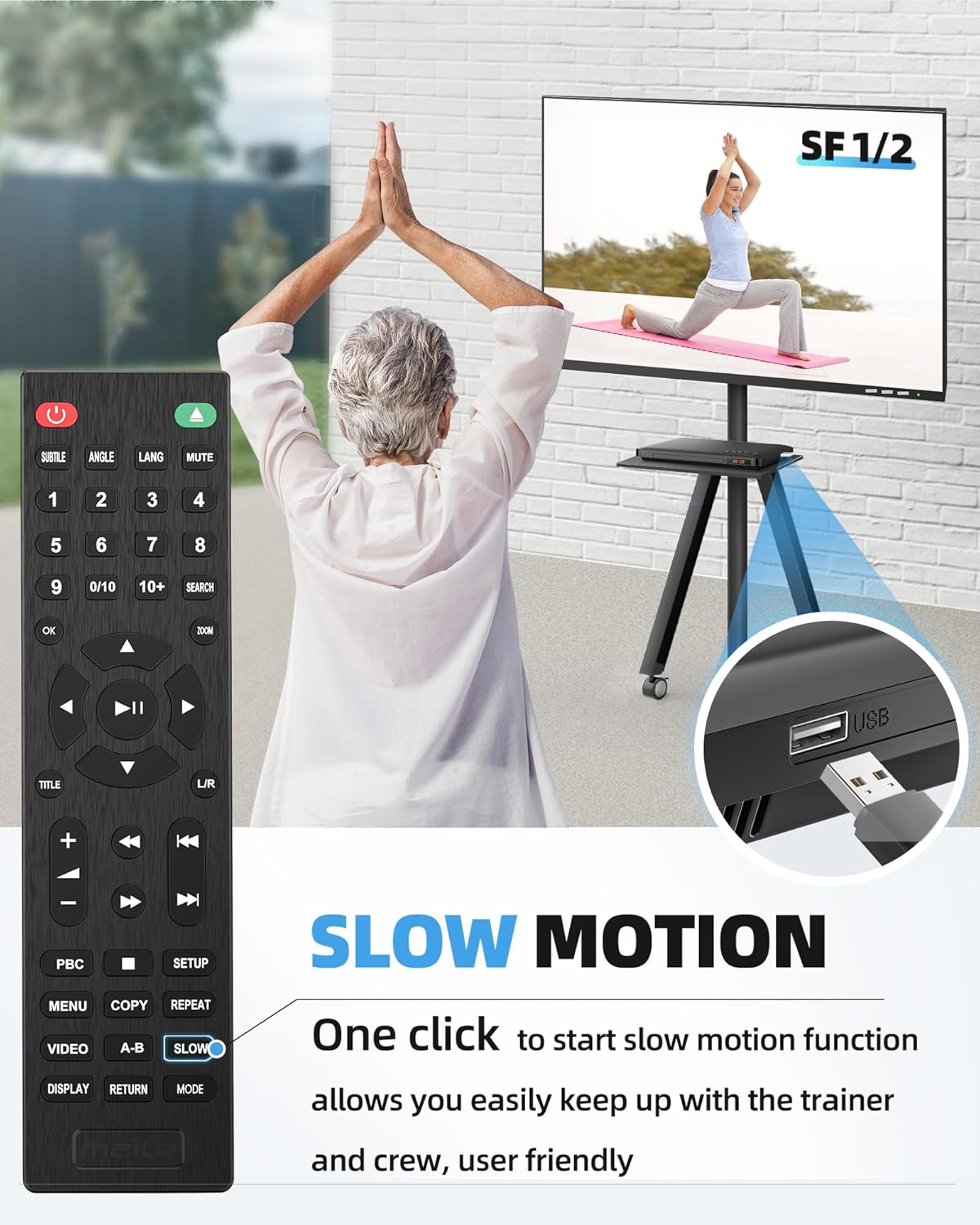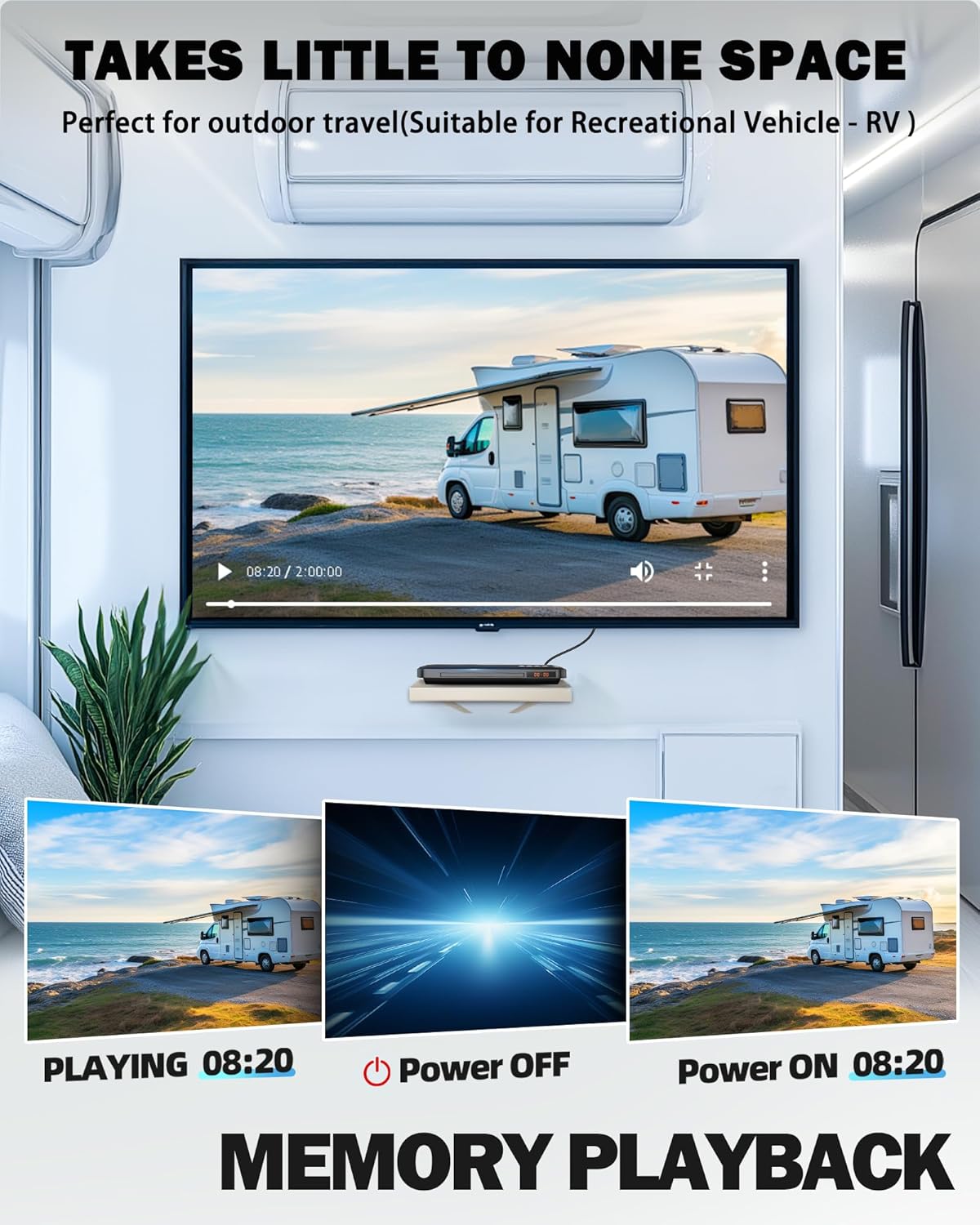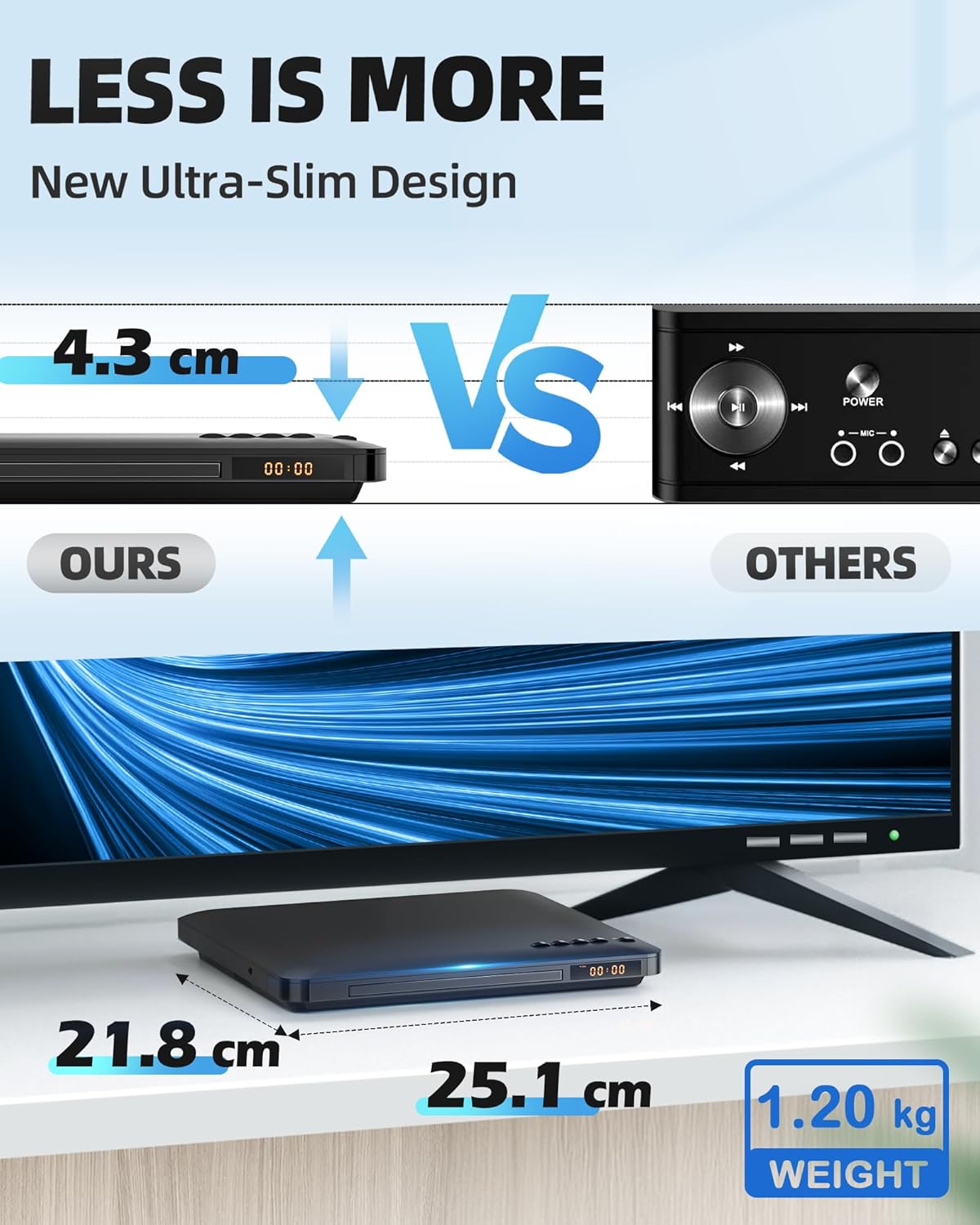 • Компактен DVD плейър: Този новопроектиран тънък CD/DVD плейър не е толкова обемист, колкото традиционните устройства, дебел е само 4,3 сантиметра и тежи само 1,2 кг. Може лесно да се съхранява в малки пространства, като например телевизионни шкафове, каравани и кухни. DVD плейърът за телевизор не само спестява място в дома, но е и семпъл и стилен естетически елемент за вашия дом!