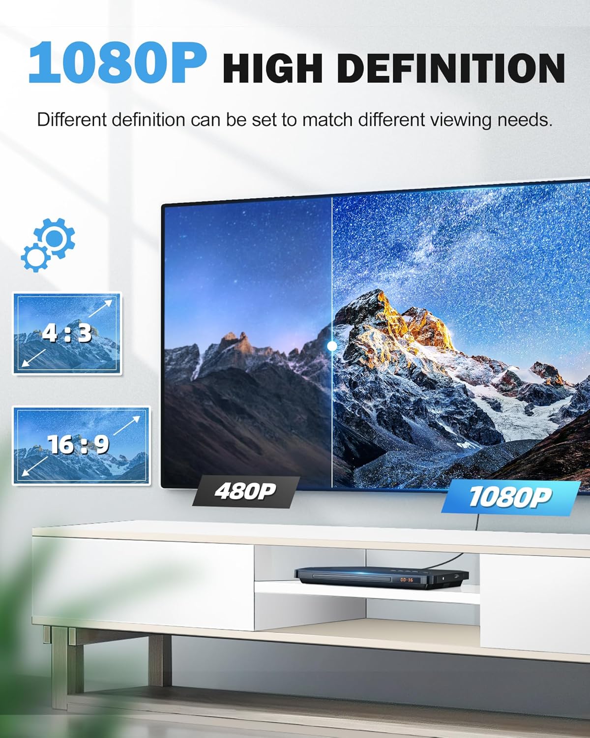 • Лесен за употреба: Този мощен DVD плейър е лесен за употреба и готов за употреба. Чудесен подарък за служители, приятели и семейство. Той извежда съдържание чрез възпроизвеждане на диск, HDMI, USB входове и AV портове на дисплей с висока разделителна способност, осигурява зашеметяващи цветови ефекти и подобрява домашното забавление.