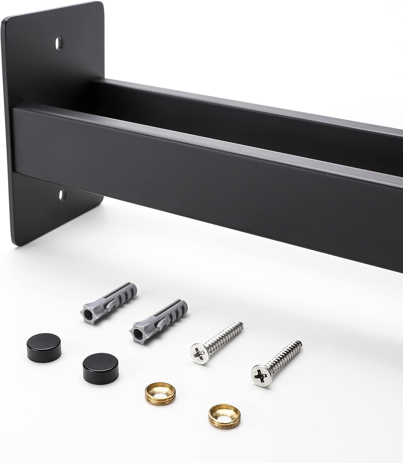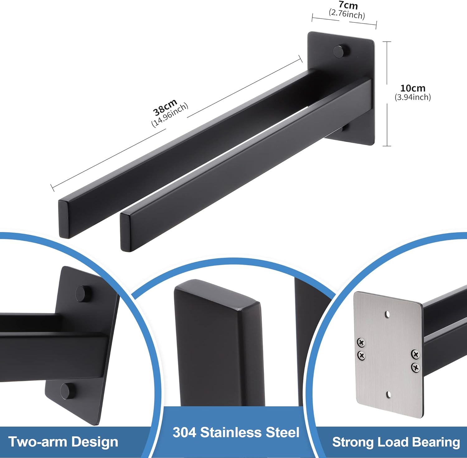 Цвят: Матово черно. Материал: Неръждаема стомана. Размери на основната плоча: 7 x 10 см. Дължина на поставката за кърпи: 38 см. Нетно тегло на поставката за кърпи: 0,58 кг. Комплектът включва: 1 x 38 см поставка за кърпи + винтове.