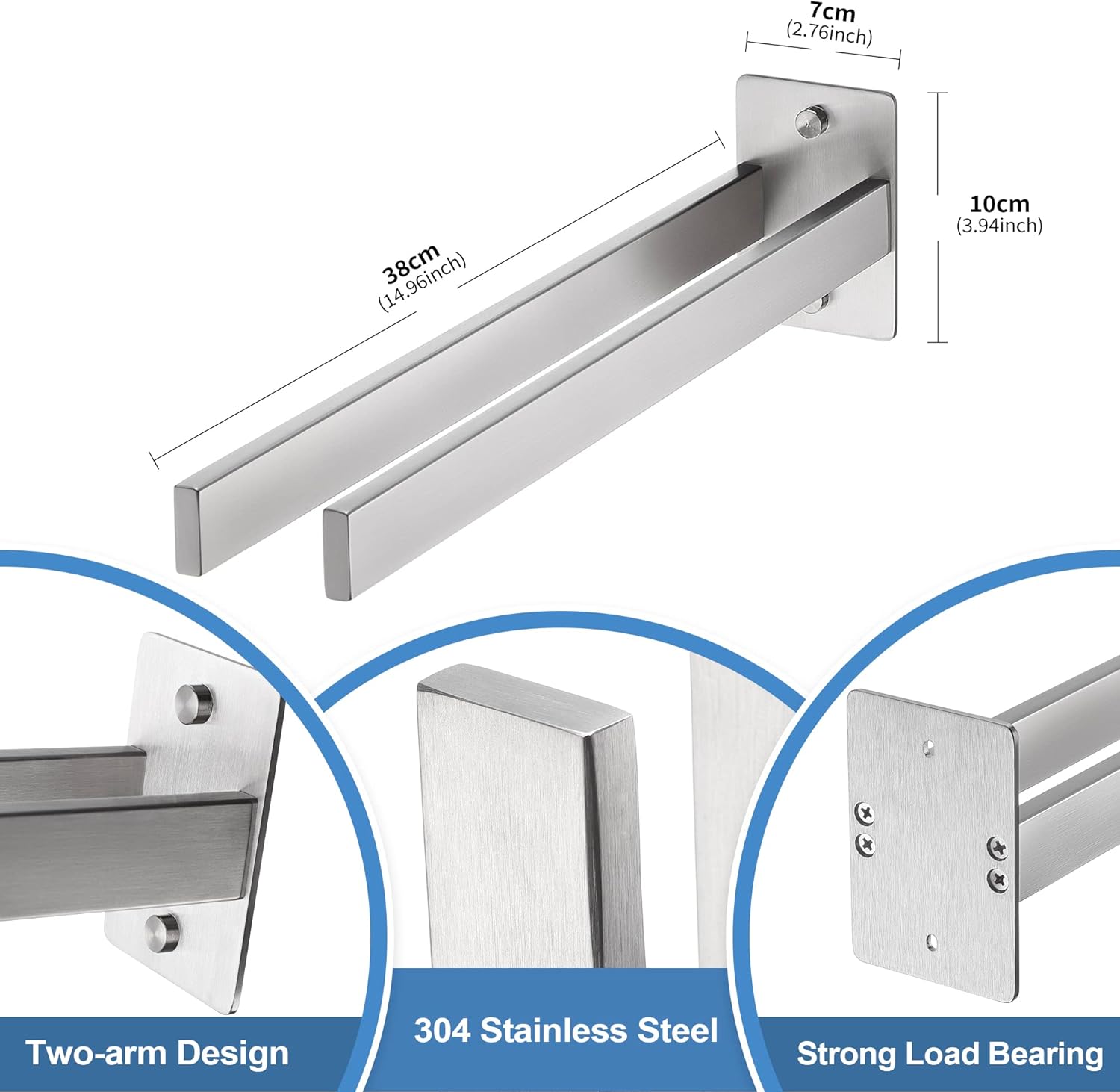 Цвят: Матово черно. Материал: Неръждаема стомана. Размери на основната плоча: 7 x 10 см. Дължина на поставката за кърпи: 38 см. Нетно тегло на поставката за кърпи: 0,58 кг. Комплектът включва: 1 x 38 см поставка за кърпи + винтове.