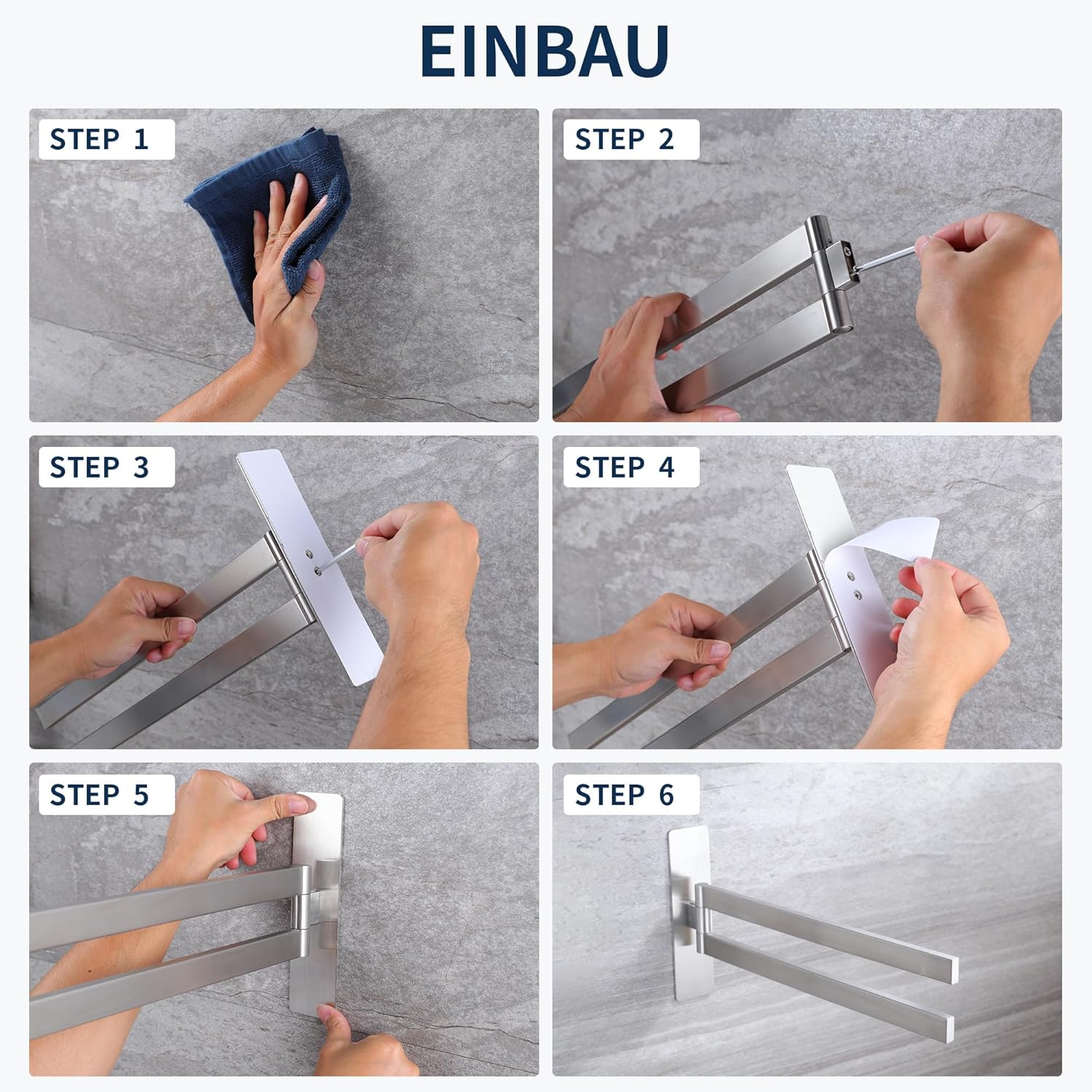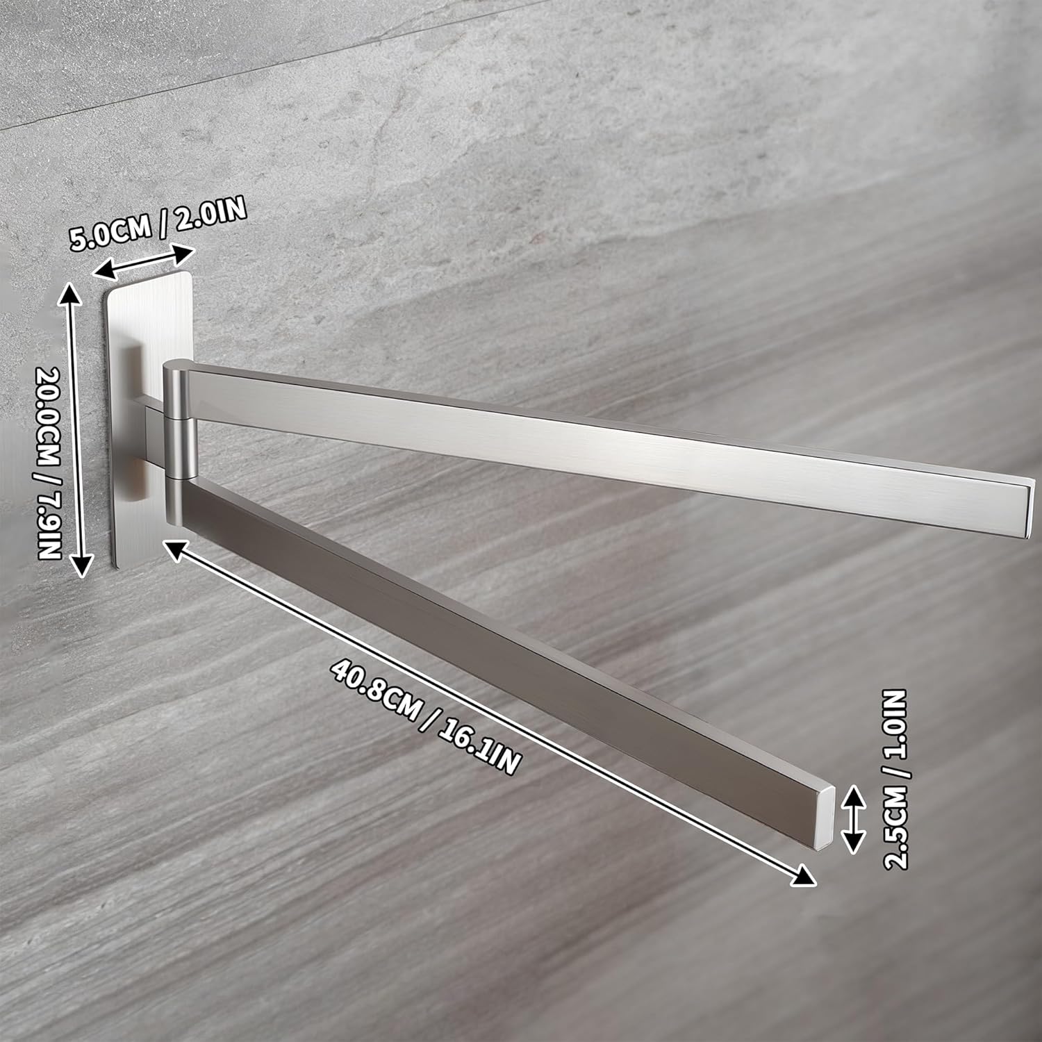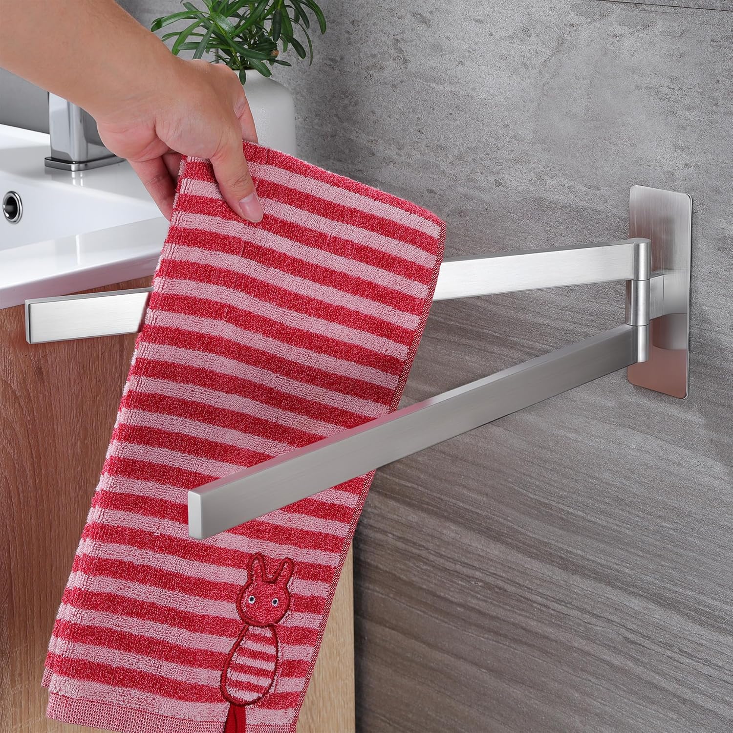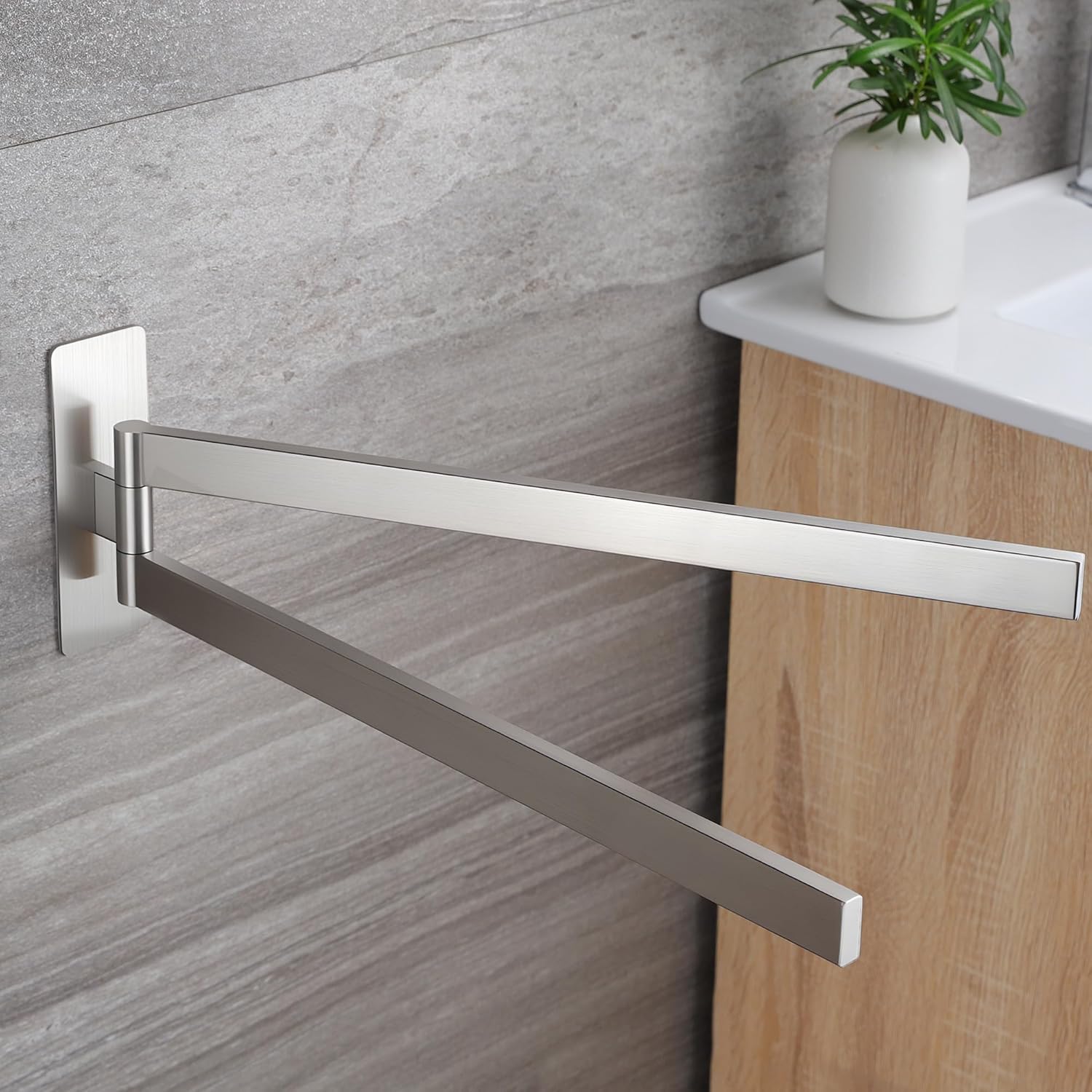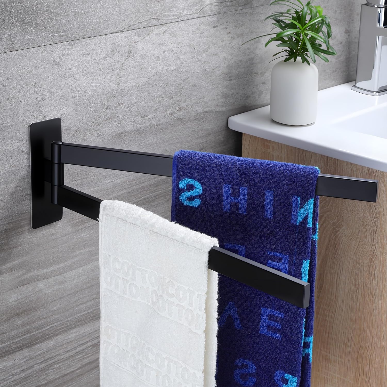 • НОВО ОБНОВЛЕНИЕ С ФУНКЦИЯ ЗА ЗАВЪРТАНЕ НА 180° Поставката за кърпи без пробиване се завърта на 180°. Дизайнът с двоен прът позволява едновременно съхранение на две кърпи, което спестява място, гъвкава и практична. Идеална за спални, бани, кухни и сервизни помещения. Моля, проверете желаните размери преди покупка.