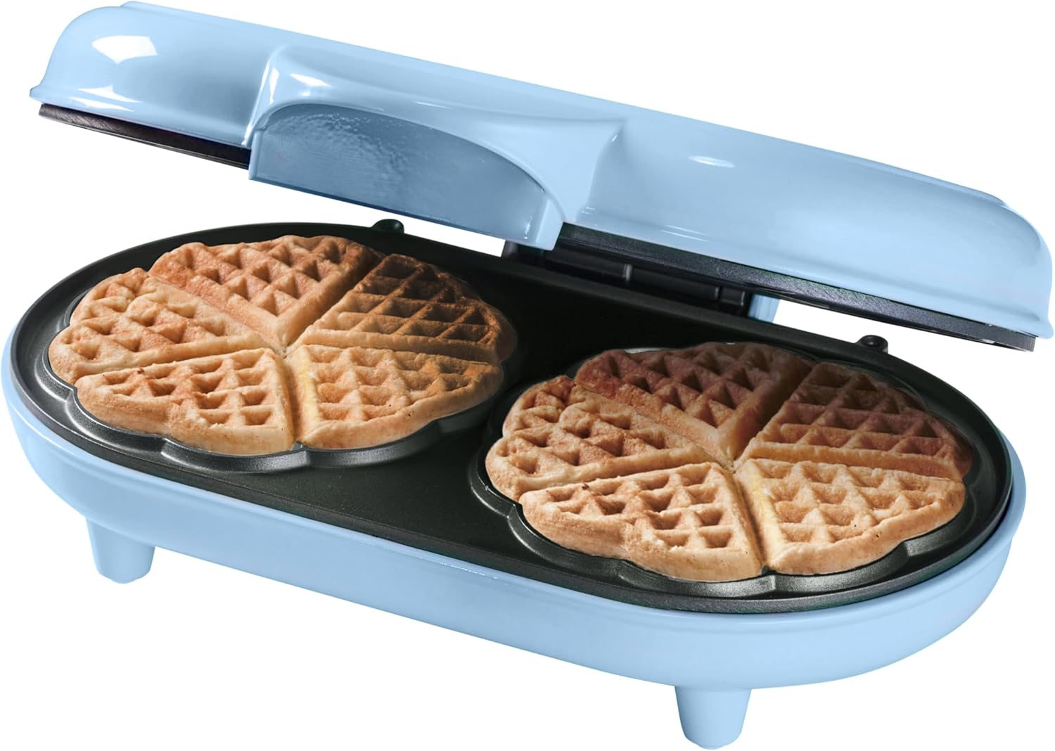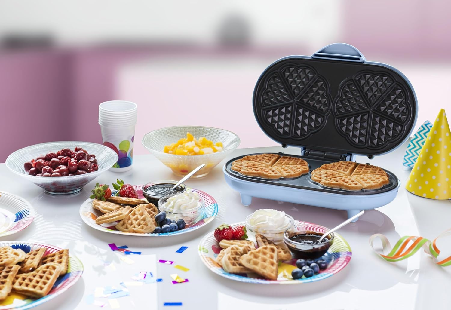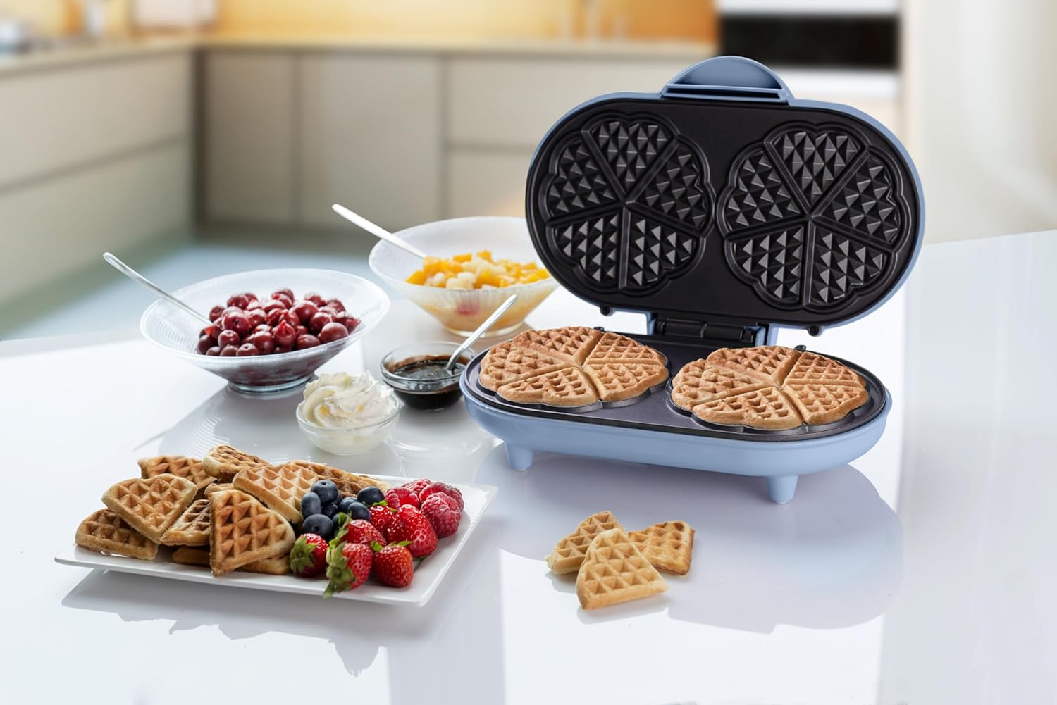 Двоен гофретник Bestron за класически гофрети във формата на сърце, гофретник във формата на сърце със светлина за печене и незалепващо покритие, идеален за детски рождени дни, Великден и Коледа, цвят: син