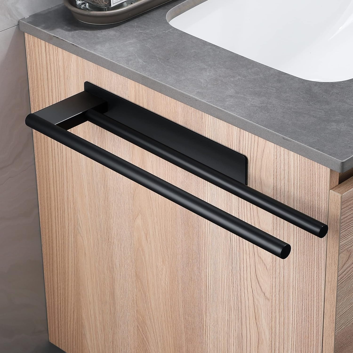 Двураменен държач за кърпи от неръждаема стомана, без пробиване, самозалепващ се, черен, матов, за стенен монтаж, за баня и кухня