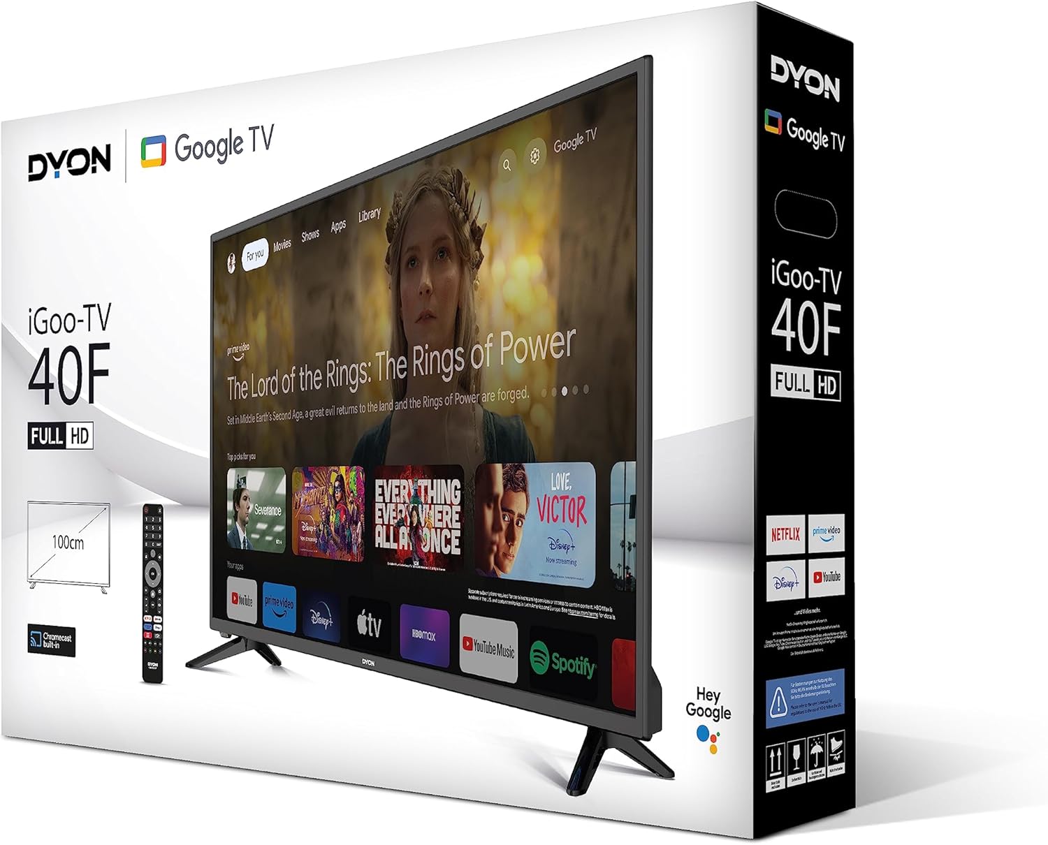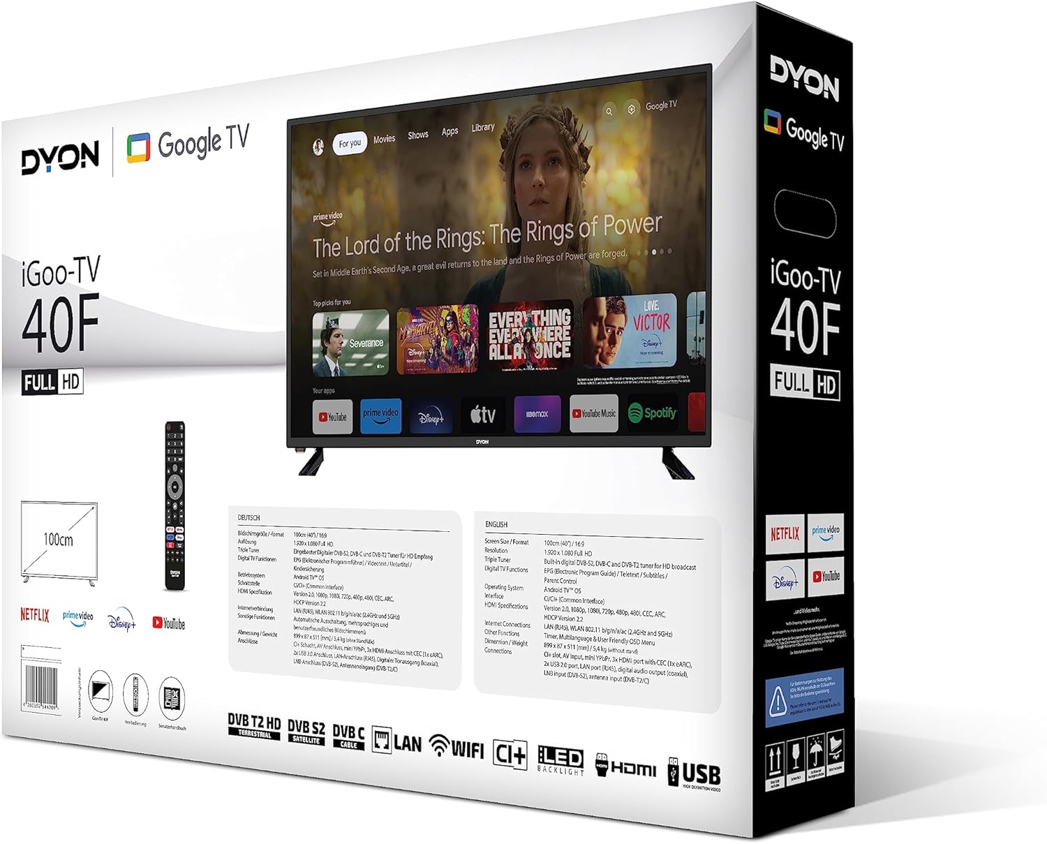 DYON iGoo-TV 40F – 40-инчов (100 см) Full HD Smart LED телевизор с Google TV, троен HD тунер, гласово управление, Netflix, Prime Video, YouTube, DAZN, Disney+