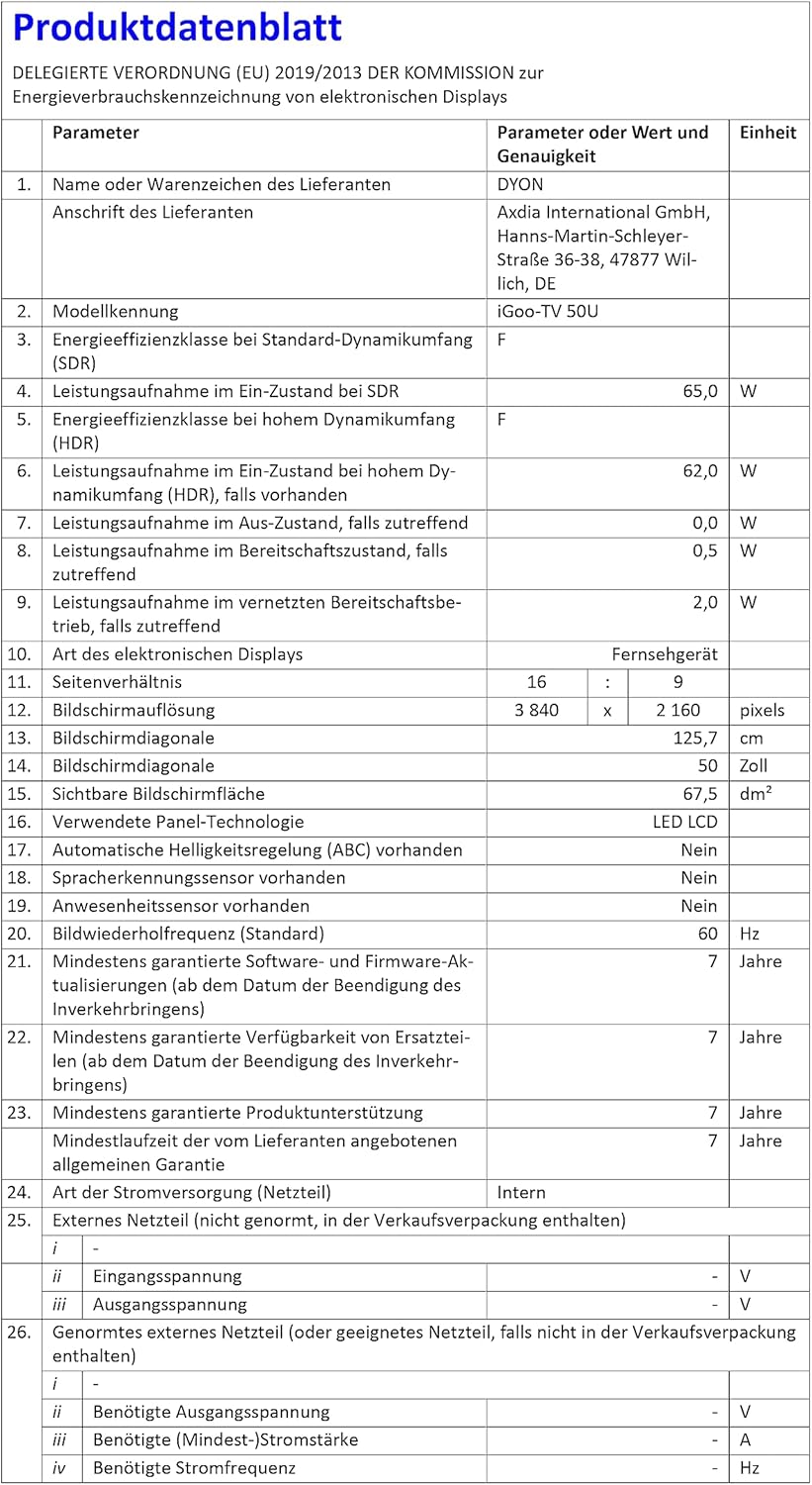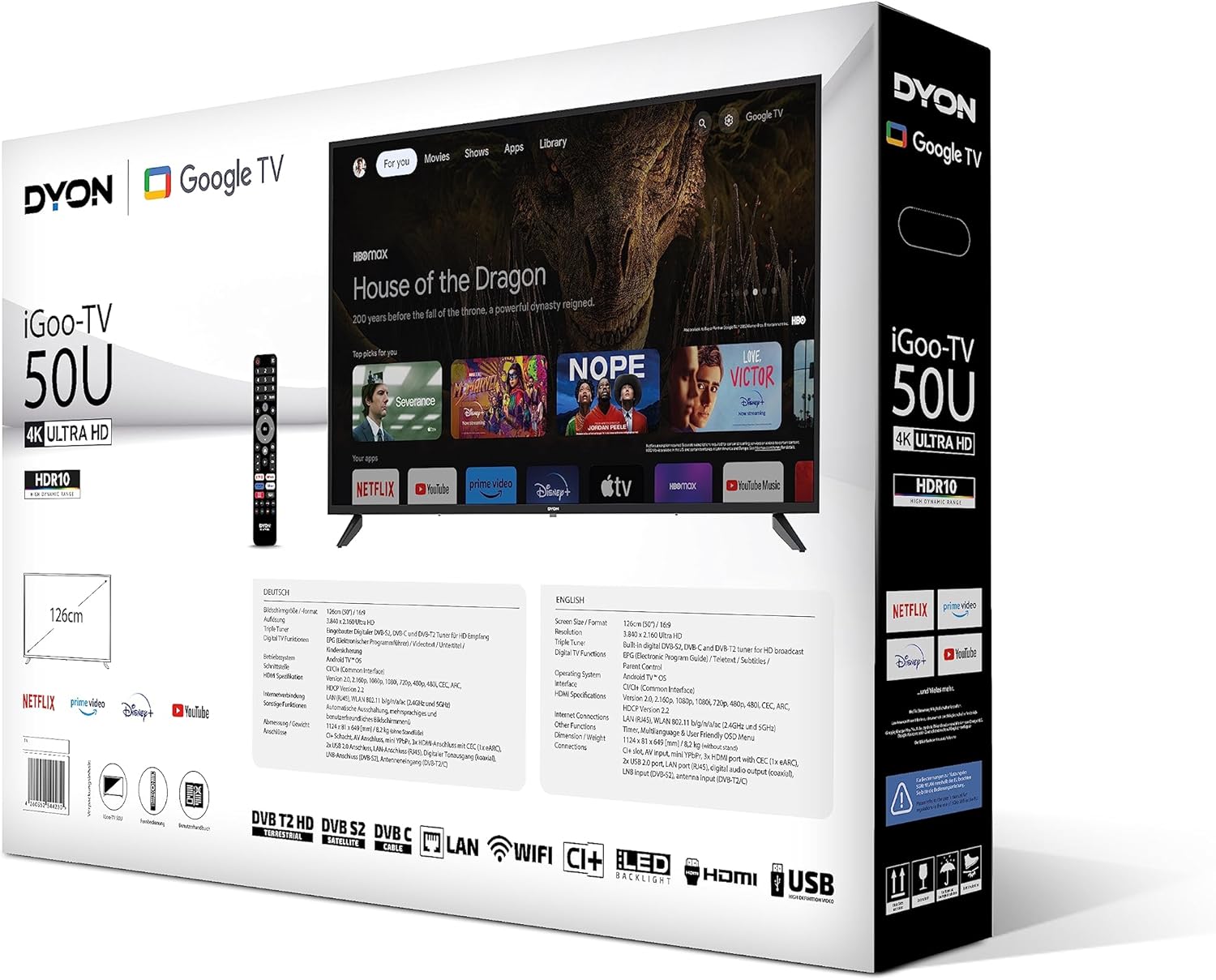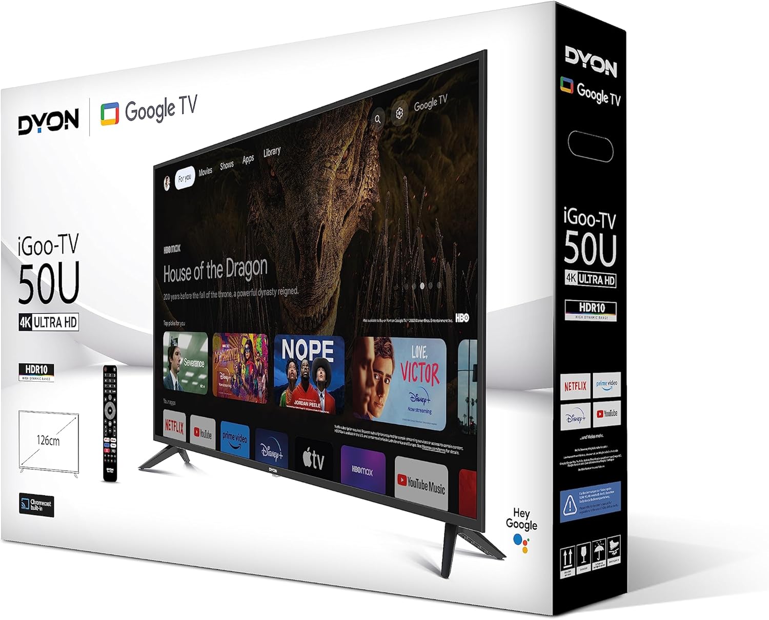 DYON iGoo-TV 50U - 50-инчов (126 см) 4K Ultra HD Smart LED телевизор с Google TV, троен HD тунер, гласово управление, Netflix, Prime Video, YouTube, DAZN, Disney+