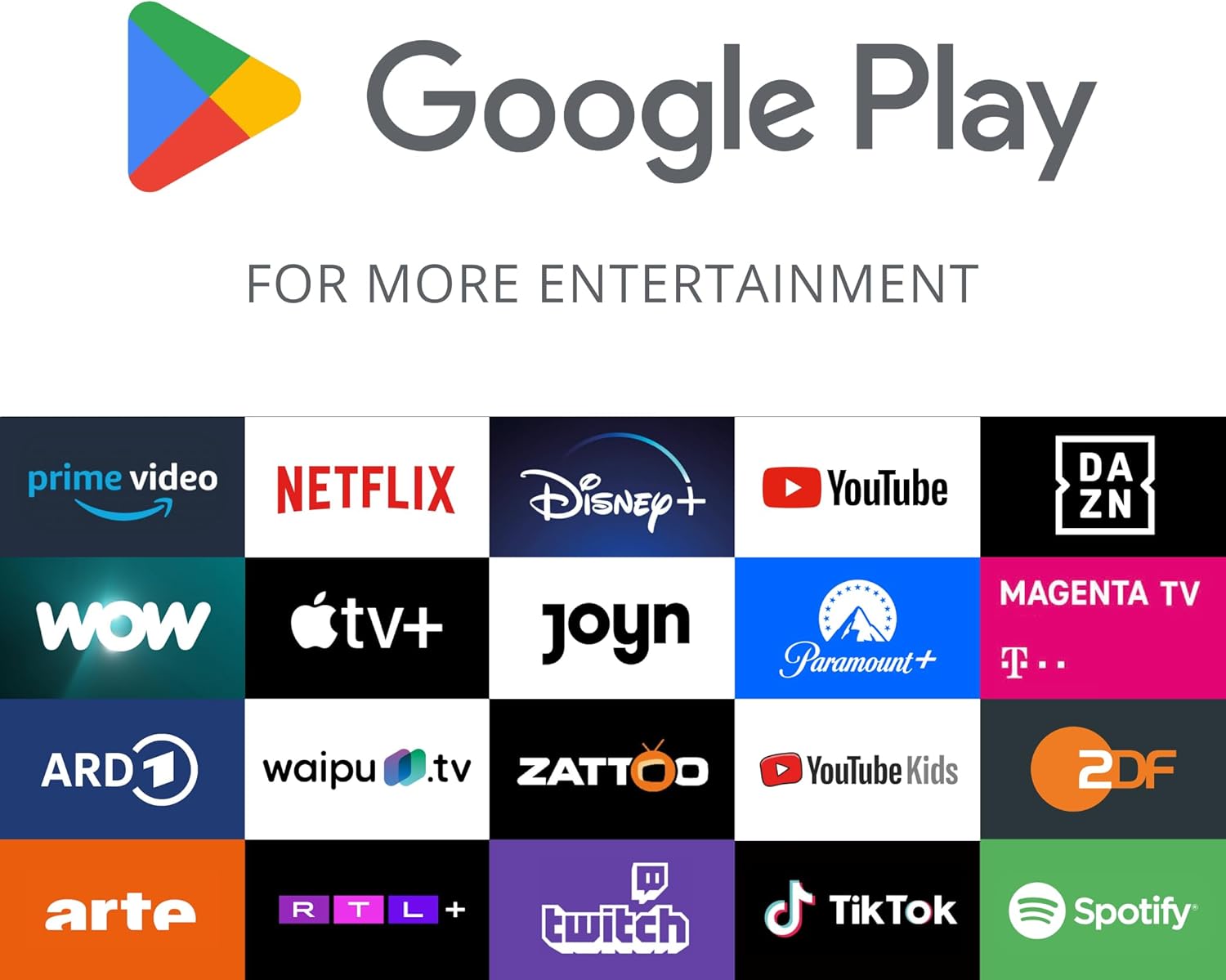 • Smart TV с Google TV – Директен достъп до Netflix, Prime Video, YouTube, +, DAZN и много други – лесно инсталирайте допълнителни приложения чрез Google Play Store.