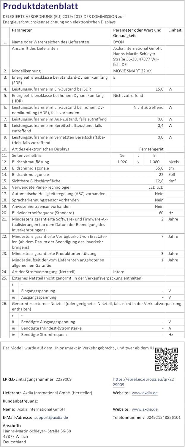 DYON Movie Smart 22 VX - 22-инчов (55 см) Full HD Smart телевизор с троен HD тунер (DVB-C/-S2/-T2), App Store, Netflix, Prime Video, YouTube, DAZN, Disney+, waipu.tv, хотелски режим