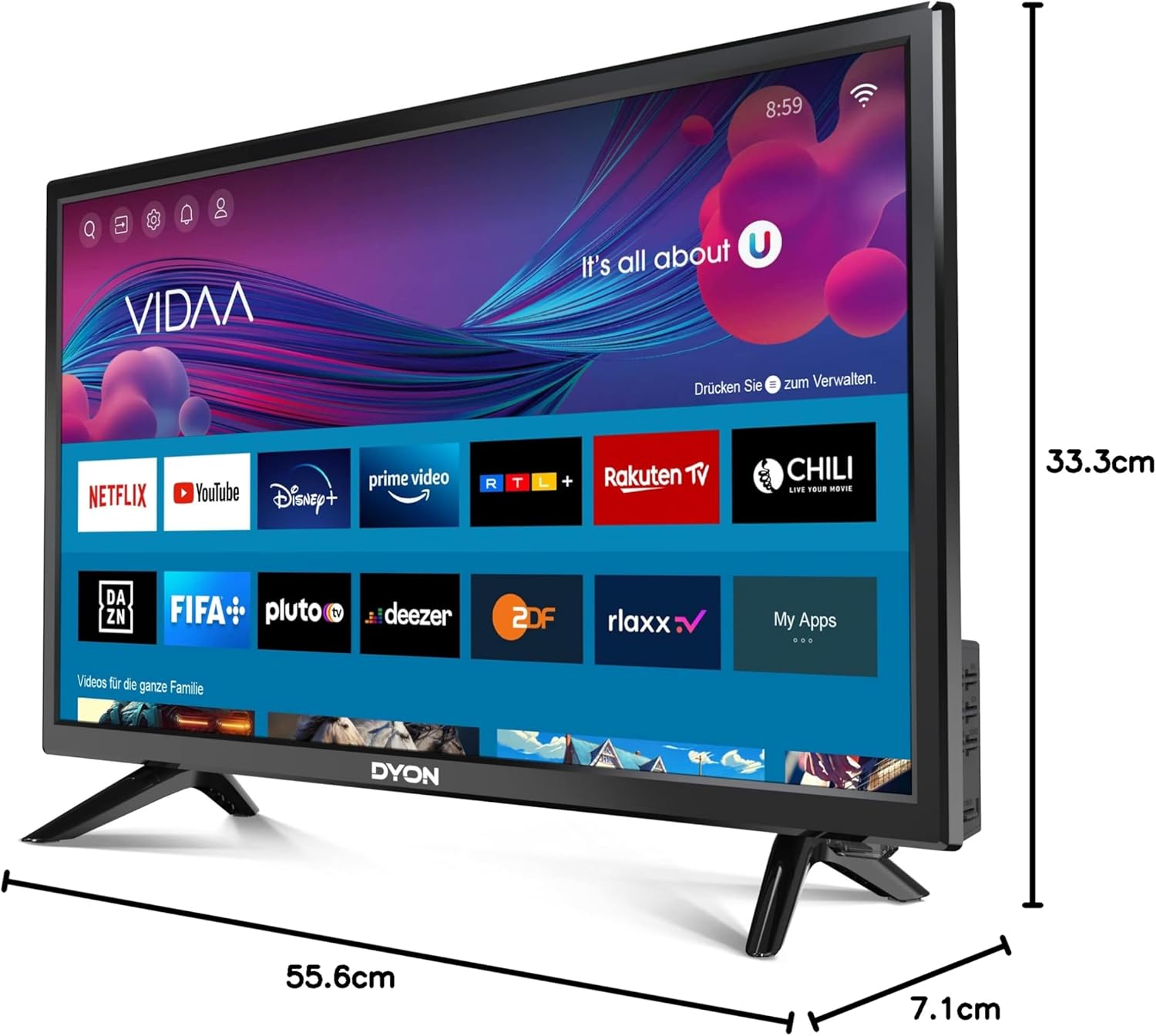 DYON Movie Smart 24 VX - 24-инчов (60 см) Smart телевизор с HD троен тунер (DVB-C/-S2/-T2), App Store, Prime Video, Netflix, YouTube, DAZN, Disney+, waipu.tv, хотелски режим