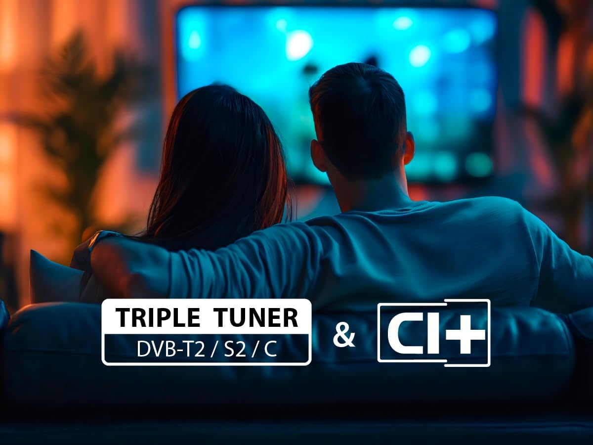 • Троен тунер - Вграденият троен тунер осигурява приемането на кабелна (DVB-C), сателитна (DVB-S2) или ефирна телевизия (DVB-T2) и по този начин ви спестява нуждата от външен приемник.