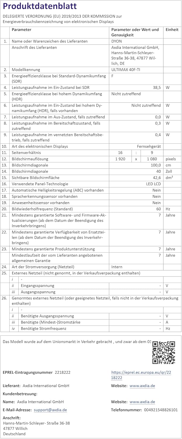 DYON ULTIMAX 40F-TI - 40-инчов (100 см) Full HD Smart телевизор с операционна система Samsung Tizen, троен тунер (DVB-C/-S2/-T2), Samsung Smart & Gaming Hub, Prime Video, Netflix, Disney+ [2025]