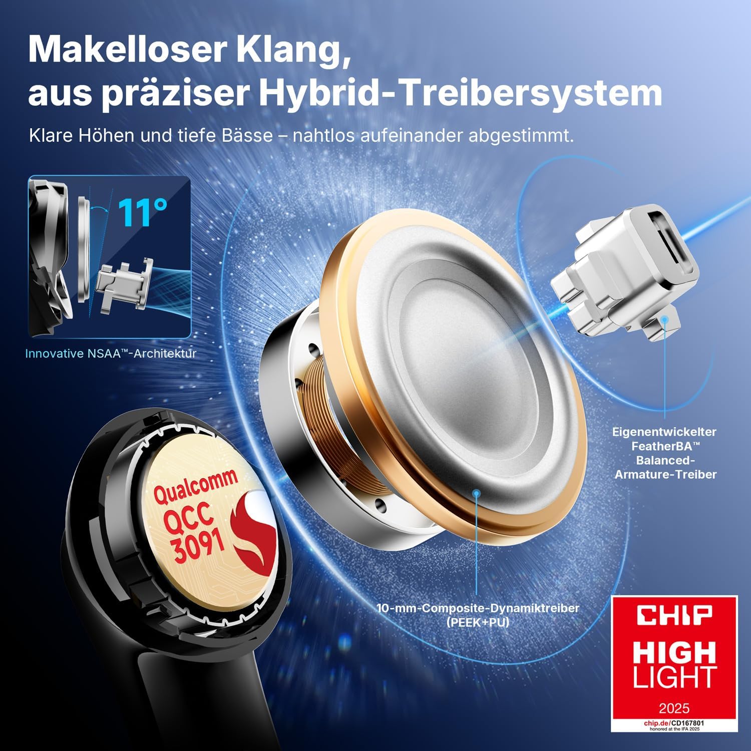 • Беззагубен, балансиран звук до най-малкия детайл: Иновативният NSAA дизайн със специално разработената балансирана арматура FeatherBA (под ъгъл от 11°) и 10 мм динамичен драйвер осигурява оптимален баланс между структура и чистота на звука. Насладете се на брилянтни високи честоти, дълбок бас и плавни преходи с поддръжка на aptX Lossless, LDAC и LC3 за Hi-Res аудио (20 Hz - 40 kHz) с до три пъти по-висока скорост на данни.