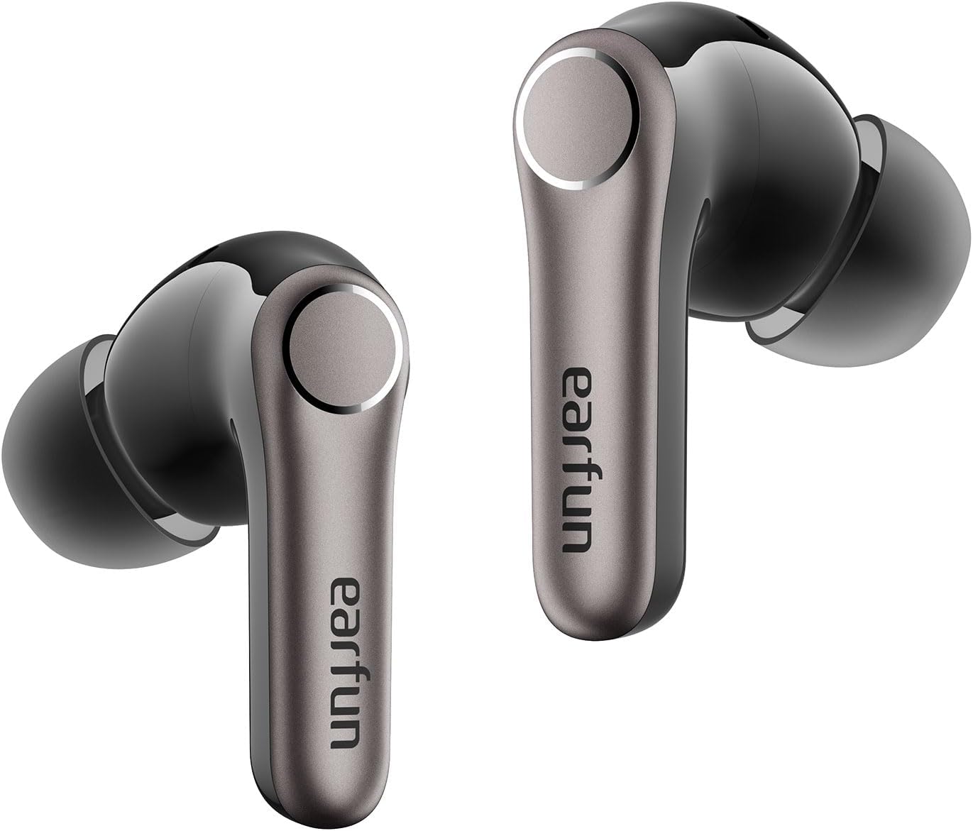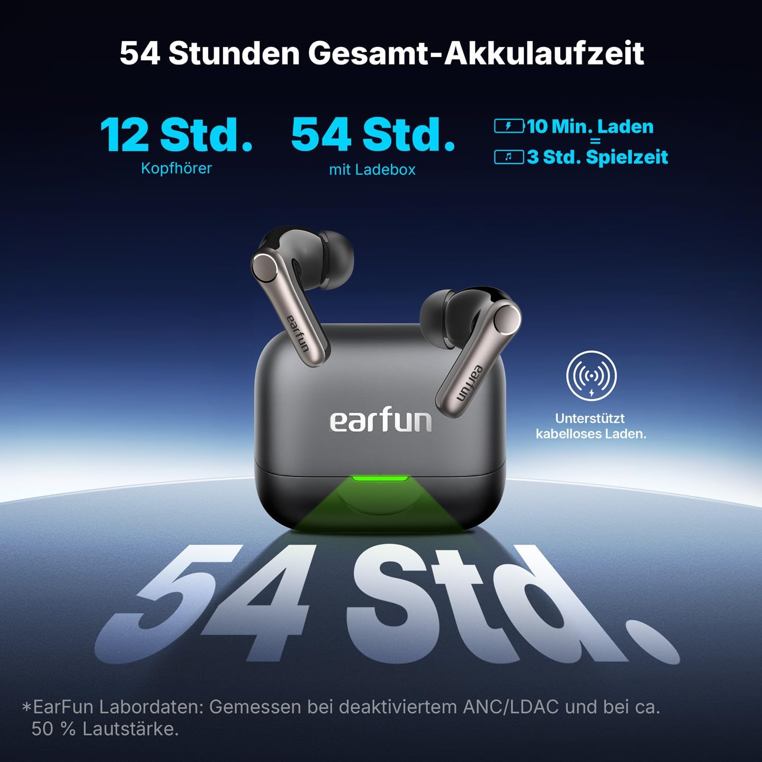 EarFun Air Pro 4+ Bluetooth слушалки с шумопотискане, хибриден двоен драйвер, Hi-Res аудио, aptX Lossless, LDAC, 6 микрофона с AI разговори, 54 часа живот на батерията, многоточково свързване, разпознаване на слушалки в ушите, Bluetooth 6.0