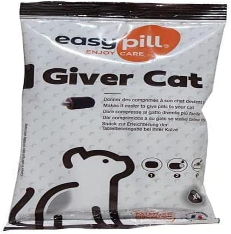 Име на размера: Пакет от 4 броя Easypill Cat Putty е професионален продукт, разработен първоначално от ветеринарен лекар и за ветеринарни лекари, за да помогне при прилагането на таблетки и хапчета на котки. Сега той редовно се препоръчва от ветеринарни лекари на собственици на домашни любимци, които трябва да прилагат хапчета на своите домашни любимци у дома. Вместо да държите котката си с кърпа и да насилвате таблетката във врата ѝ с помощта на щипка за котешки хапчета, просто откъснете парче от вкусната Easypill Cat putty и го оформете около таблетката. Вашата котка ще глътне лакомството с вкус на пилешко без никакво усилие и ще ви моли за още едно вкусно лакомство. Препоръчваме първо да свикнете с котката си и да ѝ харесате вкуса на Easypill Cat putty, като ѝ позволите да опита без никакви таблетки. След като котката ви е опитала и е харесала Easypill Cat putty, скрийте хапчето в топка от Easypill Cat putty и тя ще го глътне цялото. Приемливостта на Easypill Cat е изключително висока, като нивата достигат над 91% (тестове, проведени от Европейския изследователски център Pannelis върху квалифициран панел от 36 котки). Носител на наградите International Cat Care Cat Friendly през 2017 г., наградите Cat Friendly отличават продукти, които са довели до реална промяна в благосъстоянието и хуманното отношение към котките. Ако търсите джобчета за хапчета за котки, това е най-добрият избор.