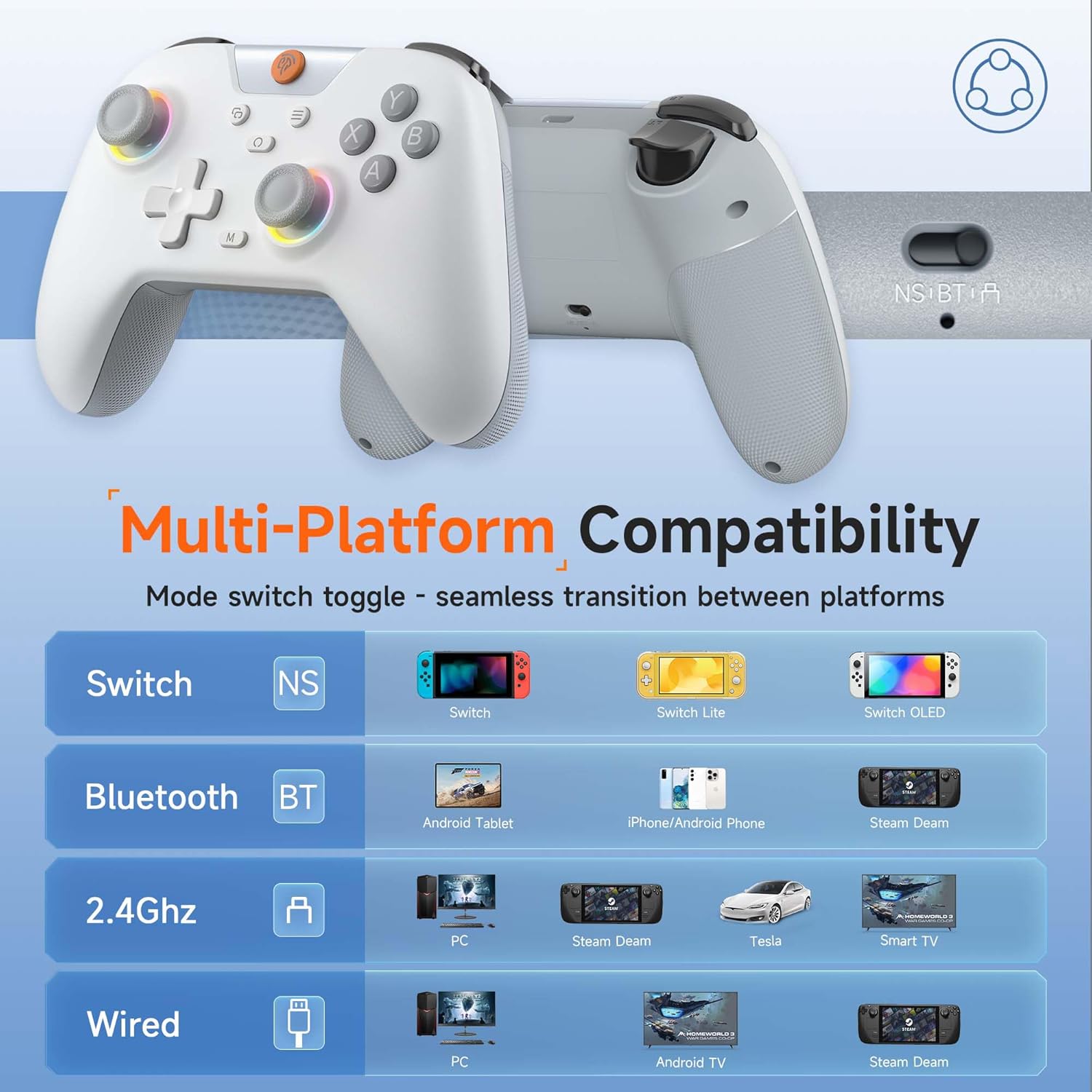 • Bluetooth & Switch & 2.4G & режим с кабел: Безжичният контролер за компютър има 4 режима на свързване: Bluetooth (steam/мобилен телефон), Switch, 2.4G (PC), кабел. При свързване е необходимо да настроите съответния режим на гърба на контролера.