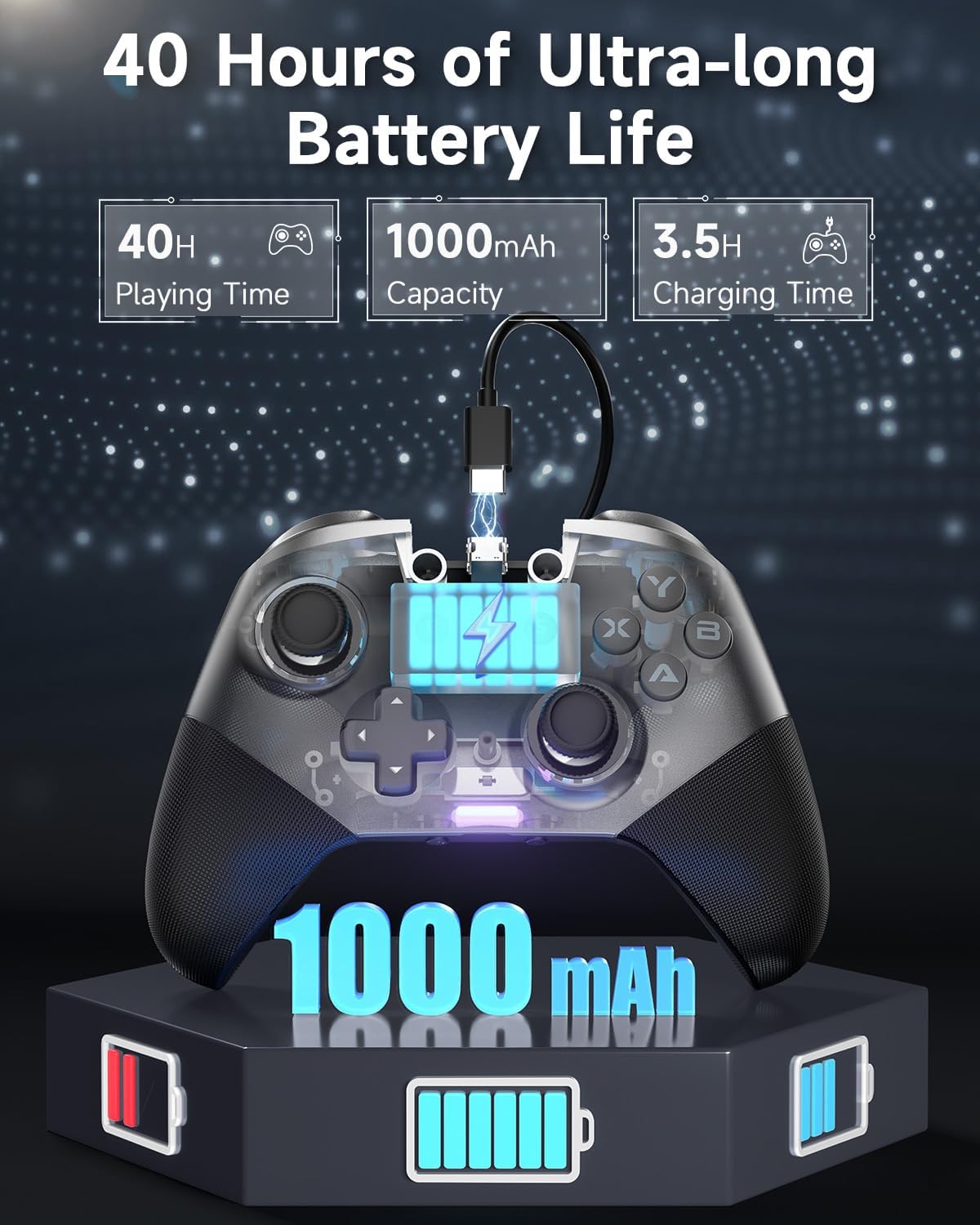 • 40 броя живот на батерията: Безжичният контролер EasySMX е оборудван с подобрена батерия от 1000 mAh, която предлага време за възпроизвеждане до 40 часа с едно зареждане.