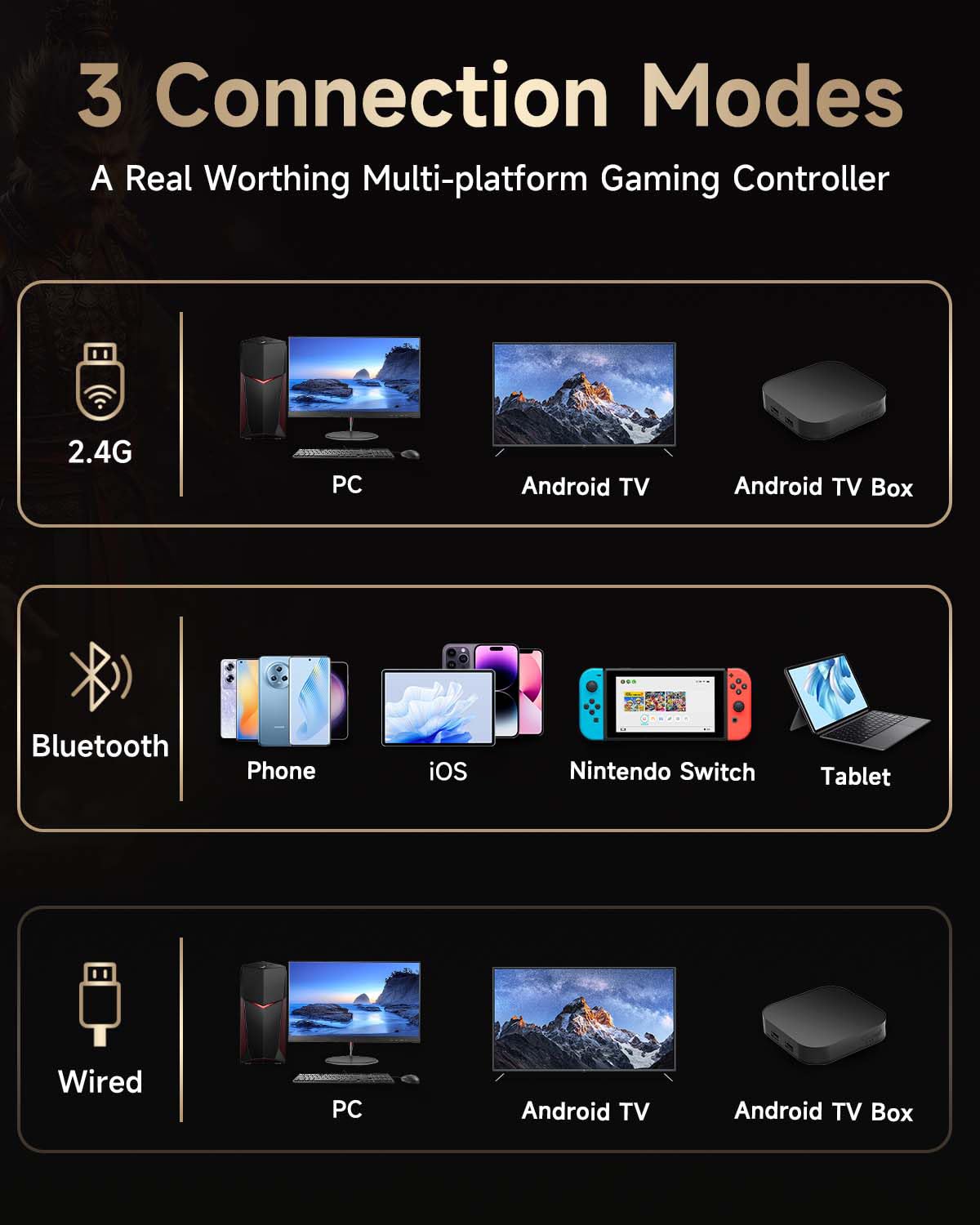 • Bluetooth / 2.4G / кабел: безжичният контролер за компютър има 3 метода за свързване: 2.4G USB приемник (PC) и Bluetooth (Switch, Android, iOS и таблет). Ако промените метода на свързване, трябва да превключите в съответния режим.