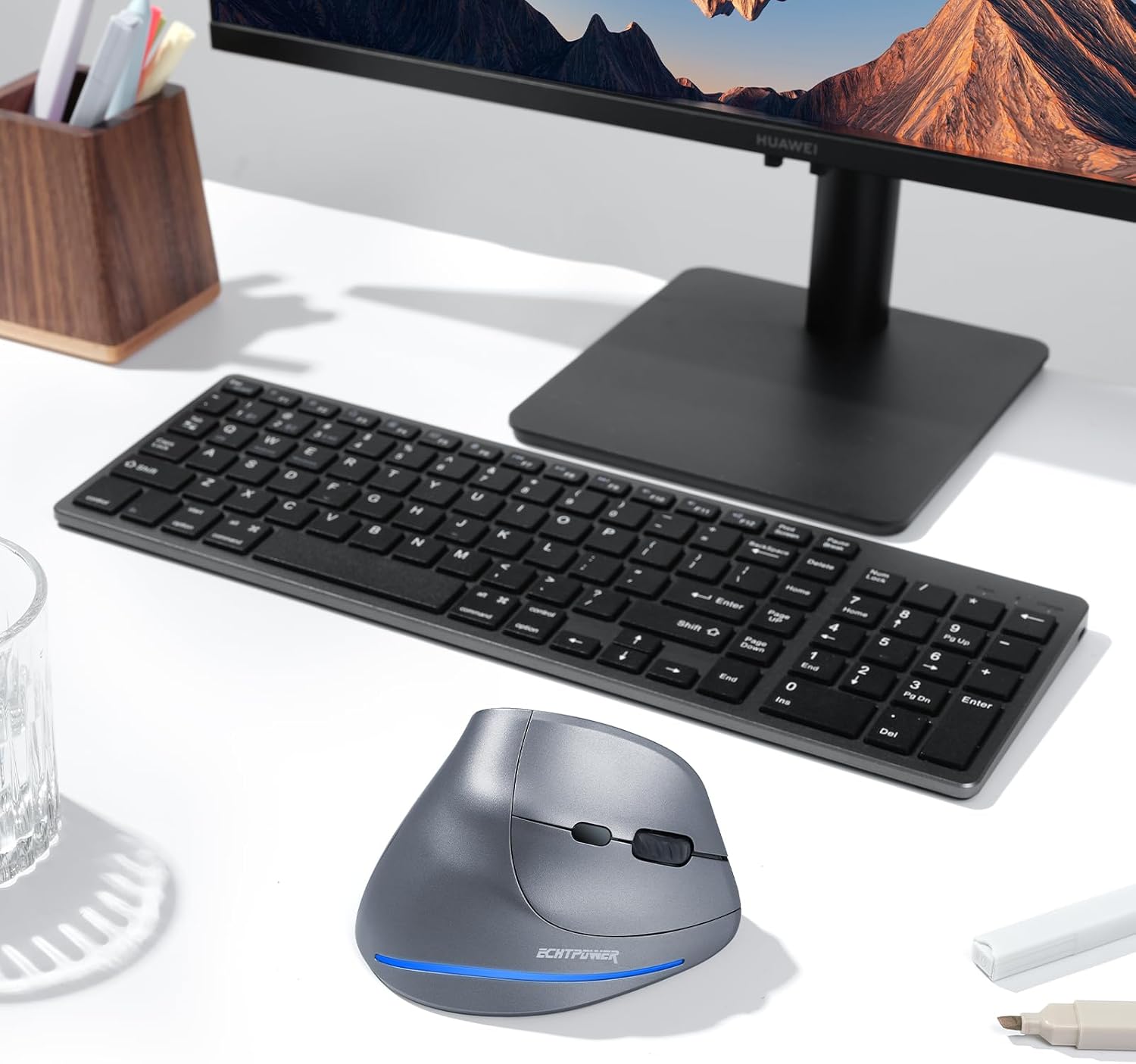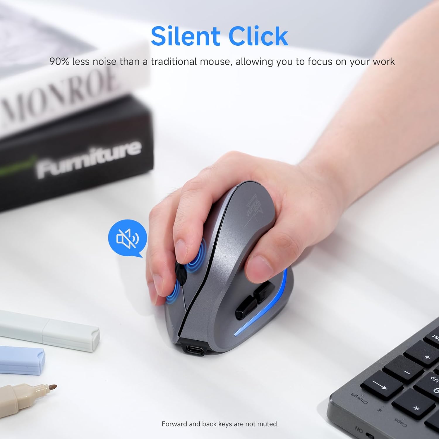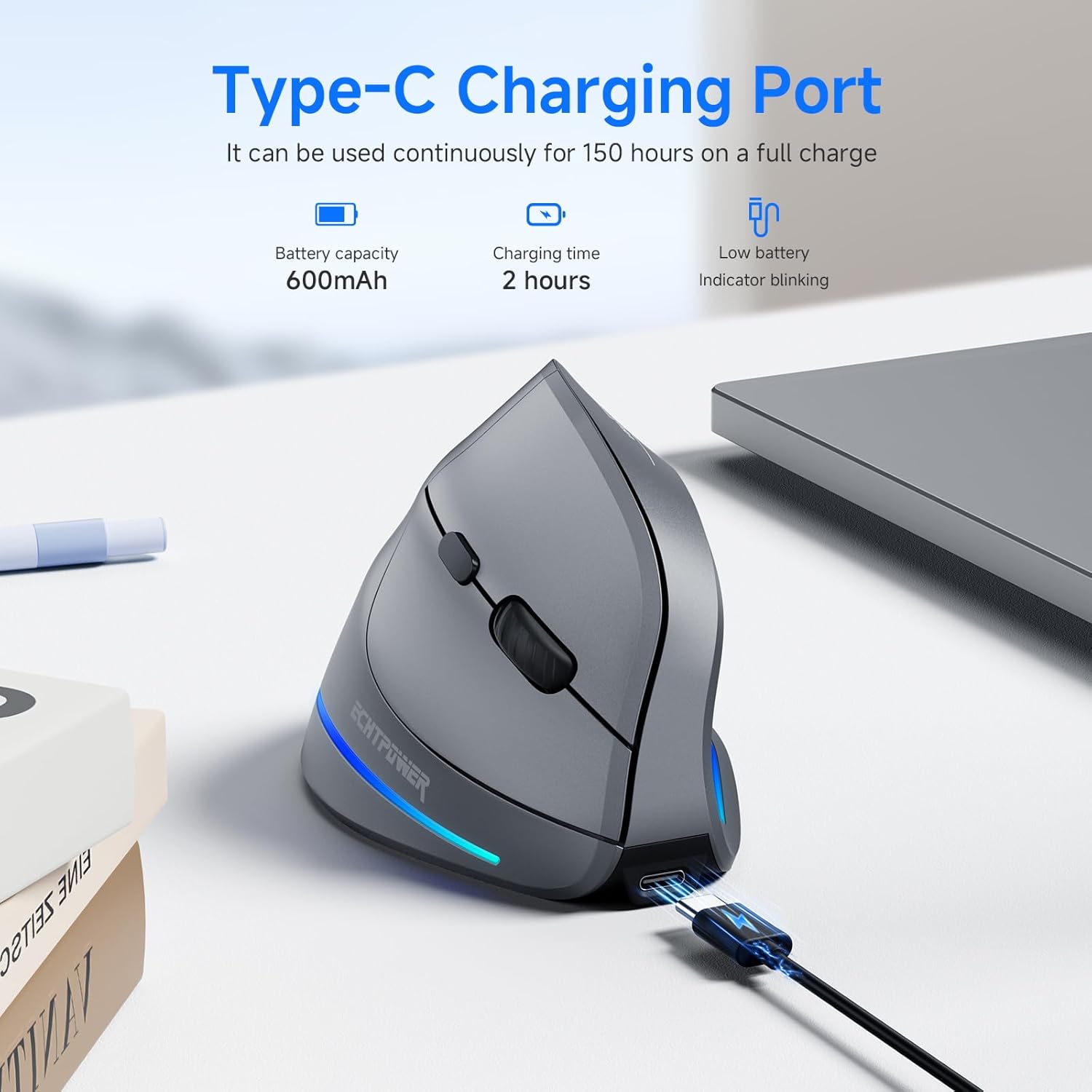 ECHTPower 2.4G вертикална ергономична безжична мишка, презареждаща се безжична мишка, компютърна мишка за офис/домашен компютър с Windows, вертикална ергономична мишка 2400 DPI, 6 бутона, за дясна ръка (сива)