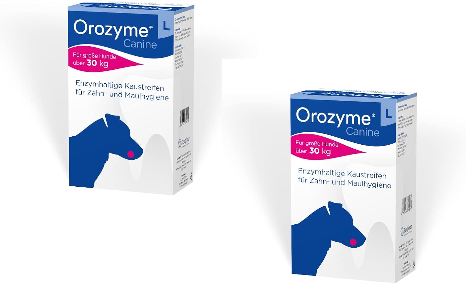 Колагенът, съдържащ се в дъвчащите ленти Orozyme, може да помогне за стимулиране на естествения апетит на кучето за дъвчене. Това механично противодейства на образуването на зъбна плака, като по този начин се бори с лошия дъх и предотвратява натрупването на зъбен камък. Отличните вкусови качества на дъвчащите ленти Orozyme се основават на естествен малцов вкус. Това прави грижата за зъбите истинско удоволствие. Състав: Телешки пържени меса, патентована LPO система, лизозим, лактоферин, малц. Съставки: Суров протеин мин. 74,5%, сурови масла и мазнини мин. 3,5%, сурови фибри макс. 2,0%, влага макс. 20,0%. Препоръка за хранене: Кучето трябва да получава по една дъвчаща лента два пъти дневно.
