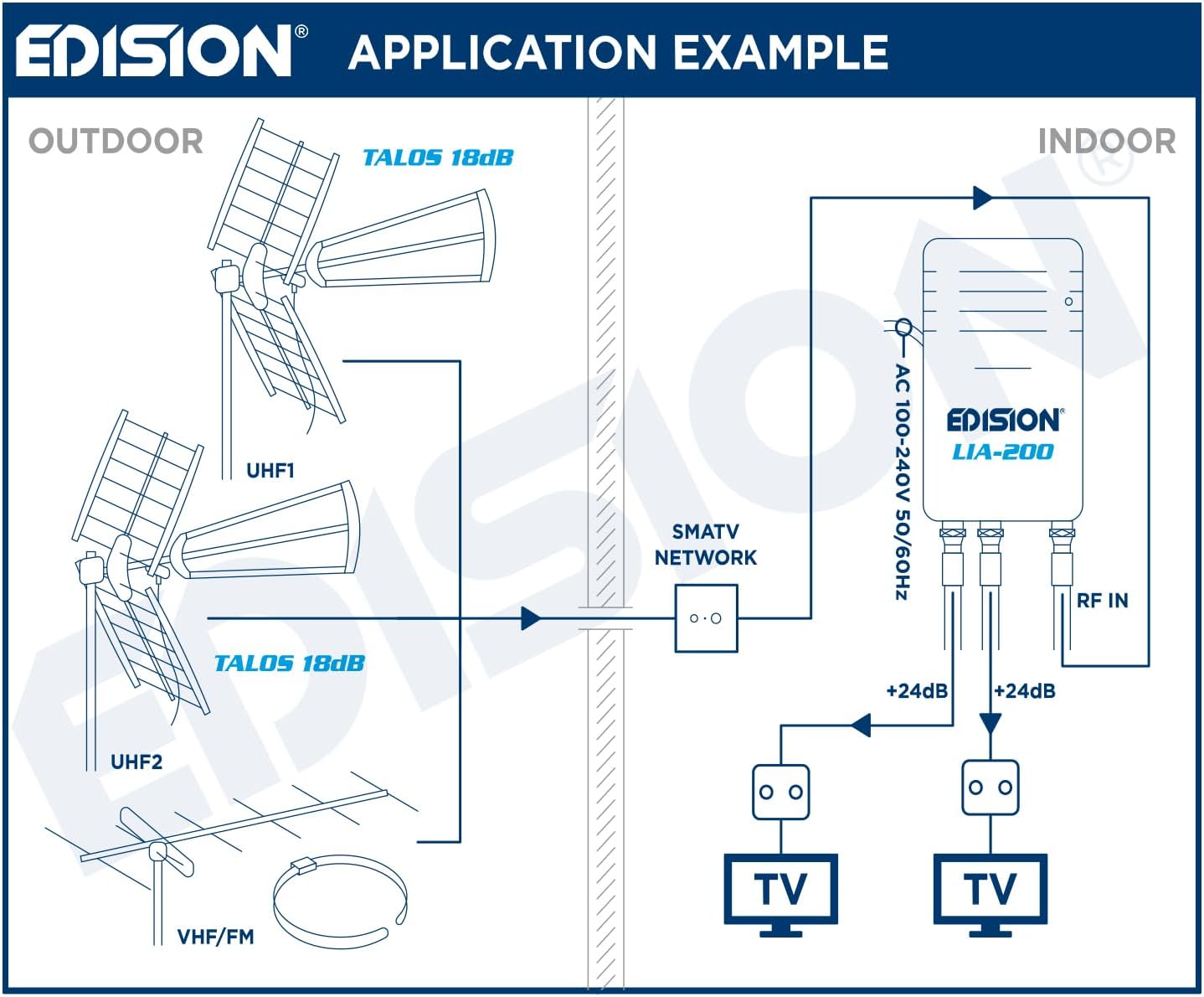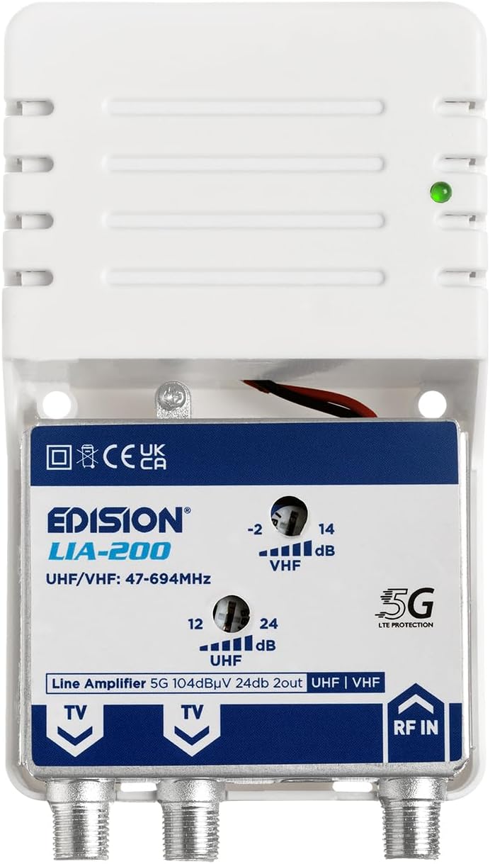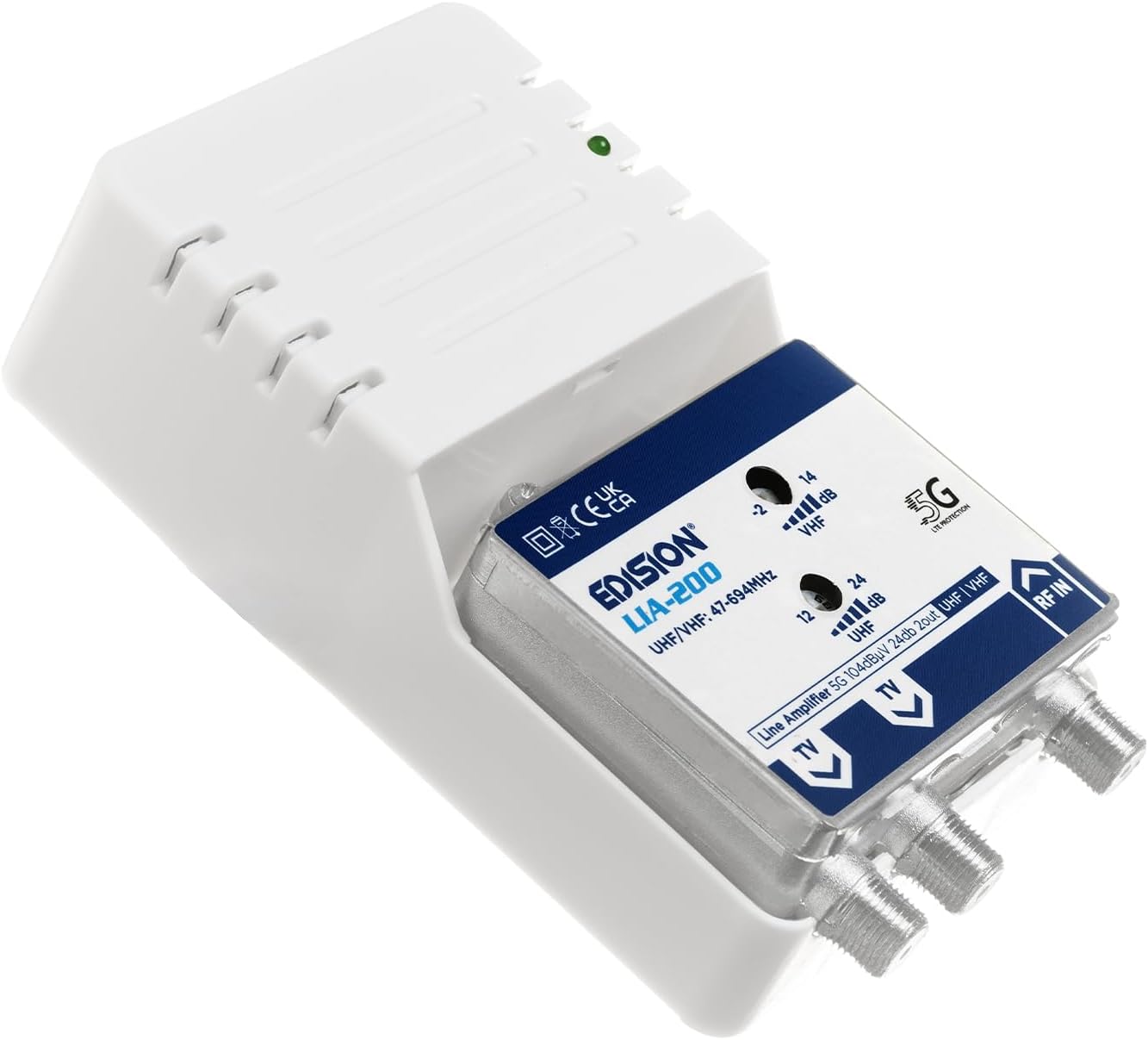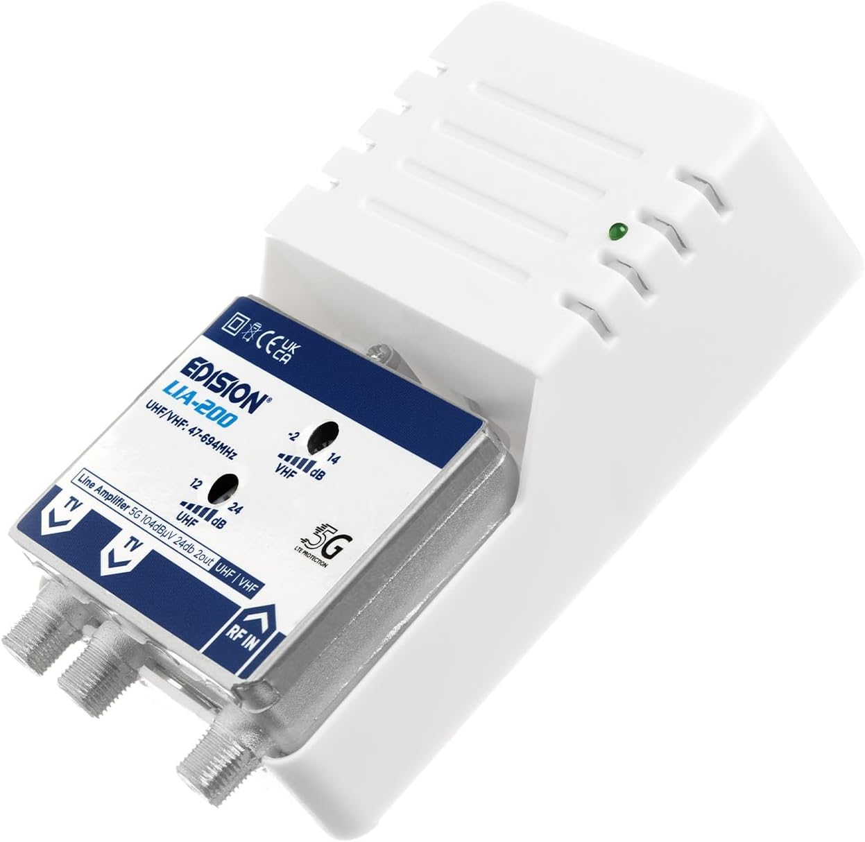 EDISION LIA-200 Усилвател за домашен монтаж UHF/VHF, 12-24db, 104dBmV, Честотен диапазон 47-694Mhz, Подходящ за кабелна цифрова и ефирна телевизия DVB-T/T2, 5G LTE филтър, 1 вход, 2 изхода
