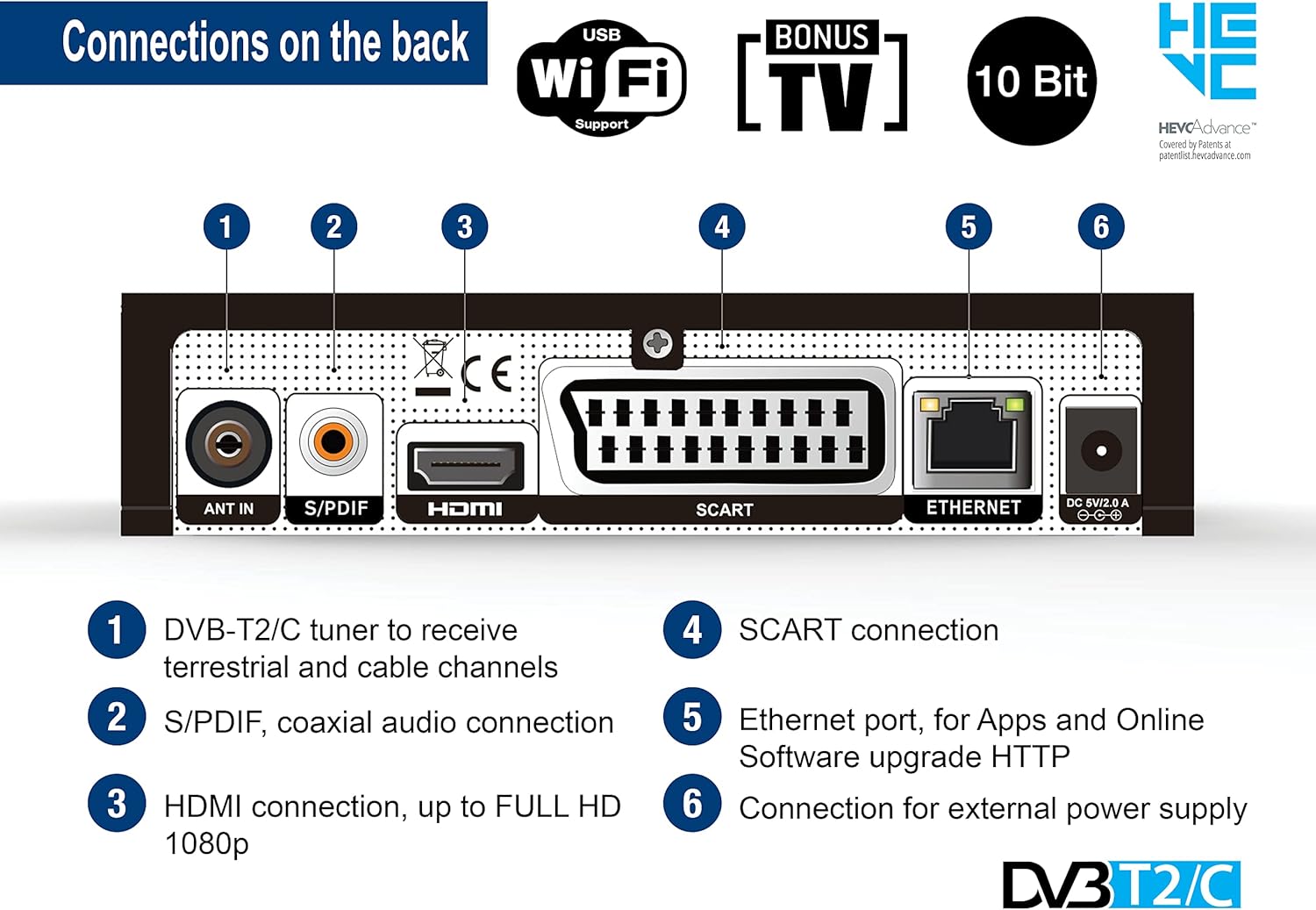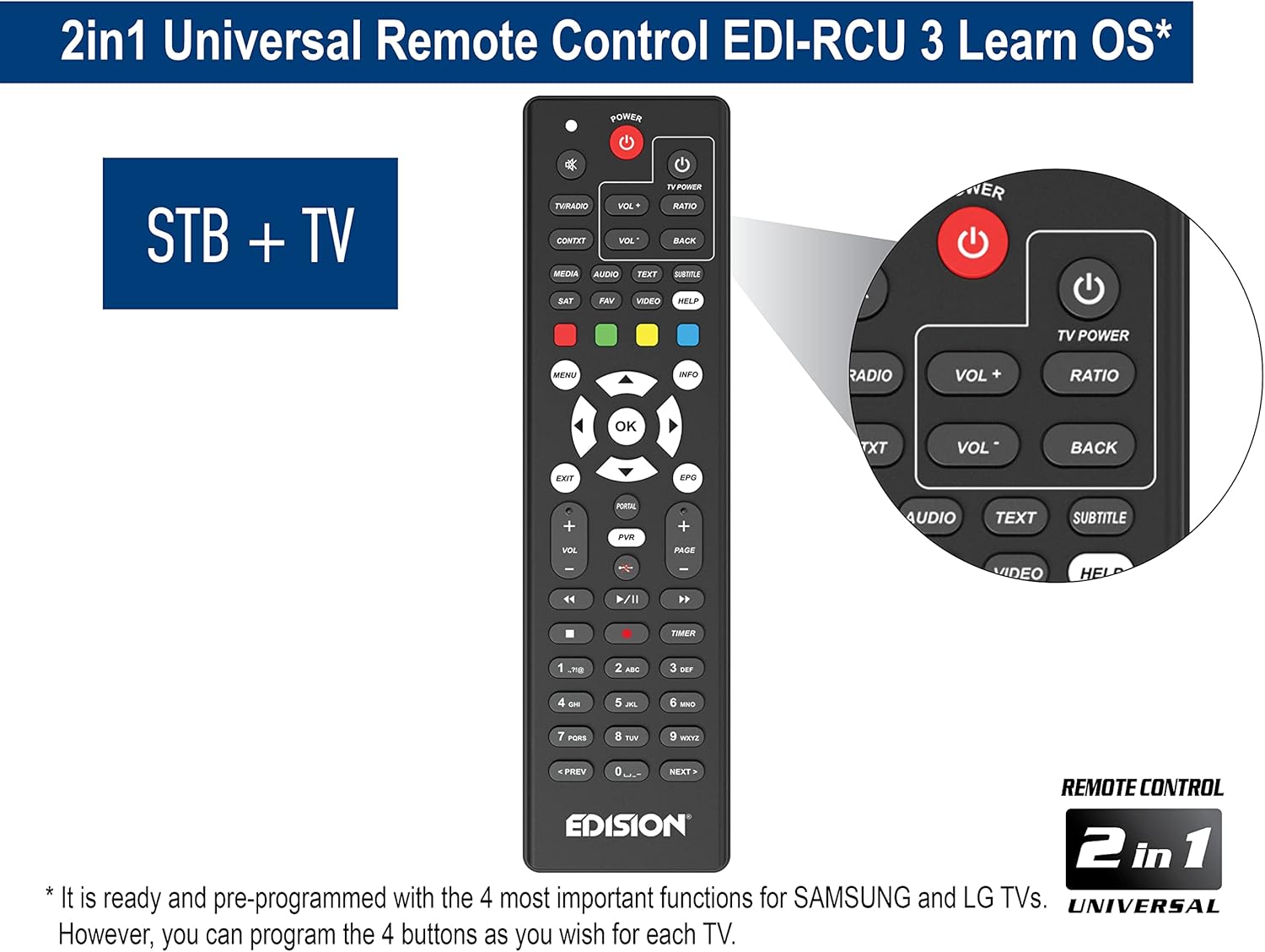 • Ефирен приемник, идеален за приемане на всички безплатни телевизионни и радио станции чрез DVB-T/T2 H265/HEVC 10 bit, акцентът е универсалното 2-в-1 дистанционно управление за приемник и телевизор, което може да контролира и 5-те най-важни функции на вашия телевизор.