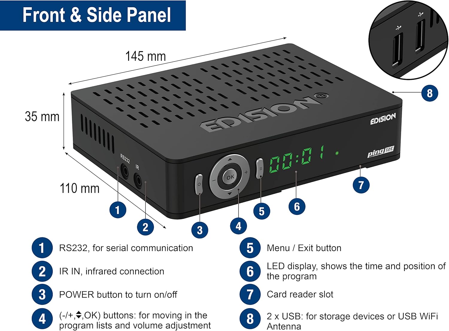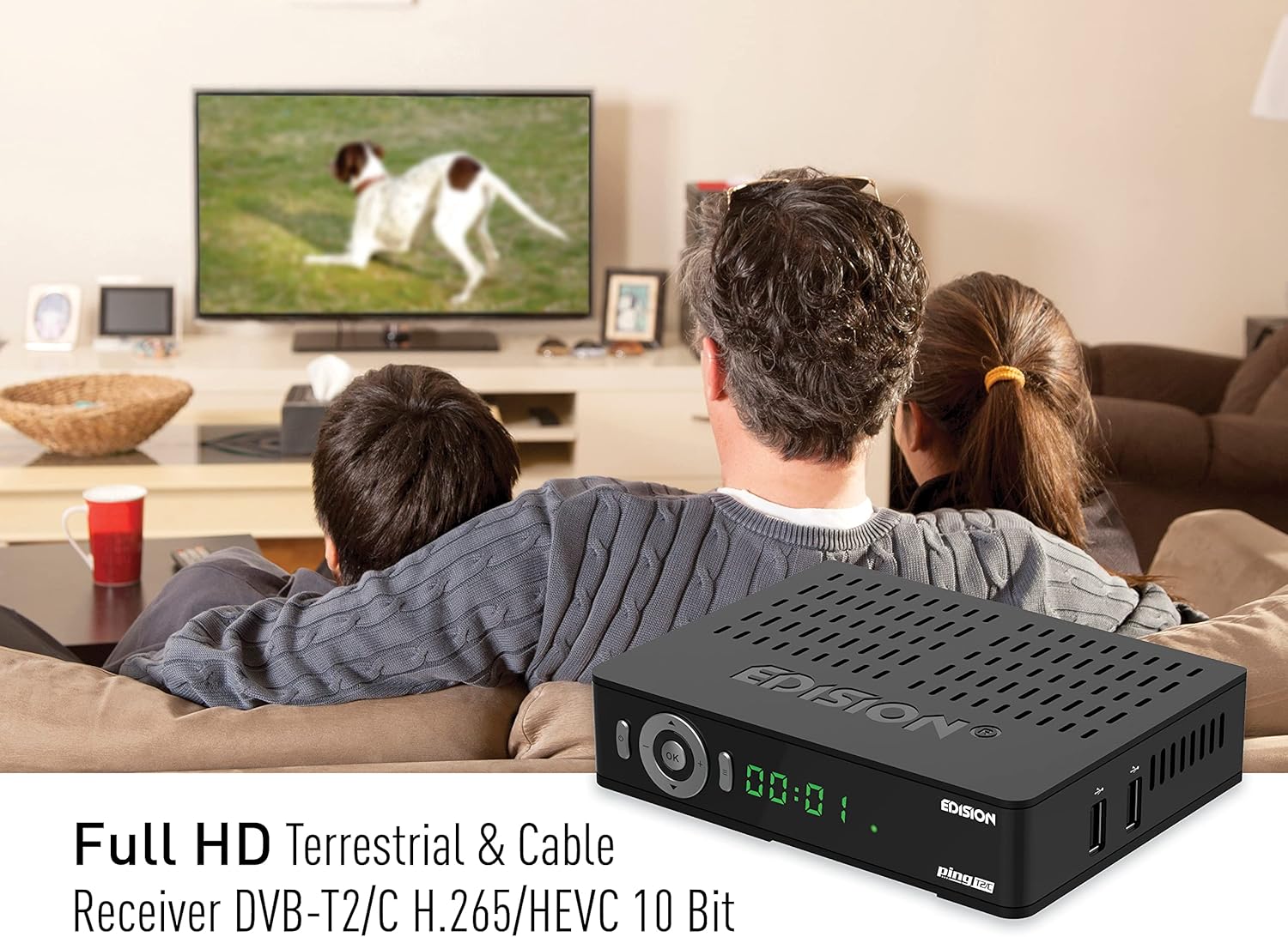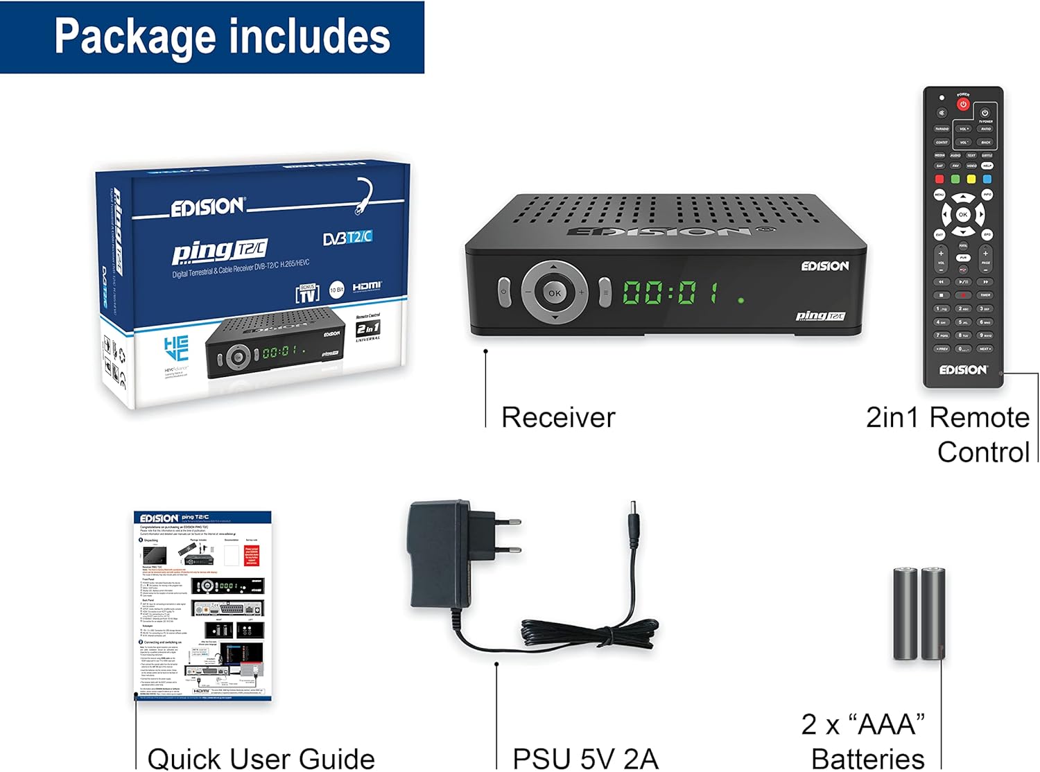 Edision Ping T2 C ефирен и кабелен приемник DVB-T2 C H.265 HEVC четец за карти Full HD PVR, 2xUSB, HDMI, SCART, LAN, S PDIF, IR Eye, R2232, USB WiFi поддръжка, универсално 2-в-1 дистанционно управление, черен