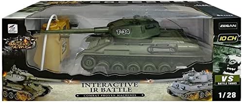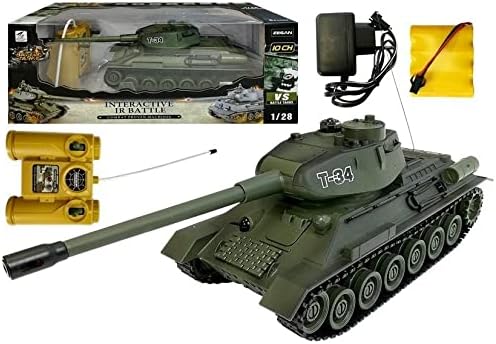Радиоуправляем боен танк EFASO T-34 с интегрирана инфрачервена бойна система. Дистанционно управляван боен танк с честота 2.4 GHz и дистанционно управление в мащаб 1:28. Подобрени характеристики на управление и още по-мощен двигател. Благодарение на лесните команди за управление, моделите са подходящи както за начинаещи, така и за напреднали и професионални моделисти. Включва реалистична симулация на стрелба с отделна дистанционно въртяща се оръдейна кула, с автентични звукови ефекти и осветление. Това е пълен пакет, вече предварително сглобен, включително интегрирана батерия, зарядно устройство, дистанционно управление и инструкции за експлоатация. Основни характеристики: - E4802 RC боен танк T-34 - мащаб 1:28 - звукови ефекти и симулация на стрелба - въртяща се оръдейна кула - размери: 260 мм x 120 мм x 110 мм - дължина на цевта: 170 мм - подходящ от 6 години - инфрачервена бойна система - инфрачервено откриване при попадения - всеки Panzer има 4 точки живот - Попаденията през основното оръдие са по-силни от попаденията на картечницата - Загубите на точки живот се представят със звукови ефекти и един от четирите светодиода за точки живот изгасва - Танк с 2 загубени точки живот губи функцията си на картечница. В случай на загуба на 3 точки живот, оръдейната кула вече не може да се върти. Съдържание на кутията: 1 x efaso E4802 RC боен танк. 1 x дистанционно управление 2.4GHz. 1 x батерия. 1 x зарядно устройство. 1 x ръководство за потребителя на немски език.