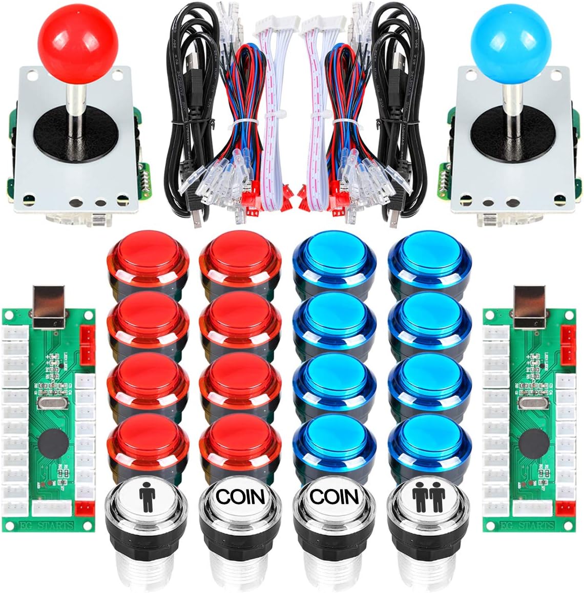EG STARTS Части за шкаф за аркадни игри 2x 8-посочен джойстик + 16x LED осветени бутона + 2 бутона за играчи + бутони за монети за Raspberry Pi 3B Моделен проект „Направи си сам“