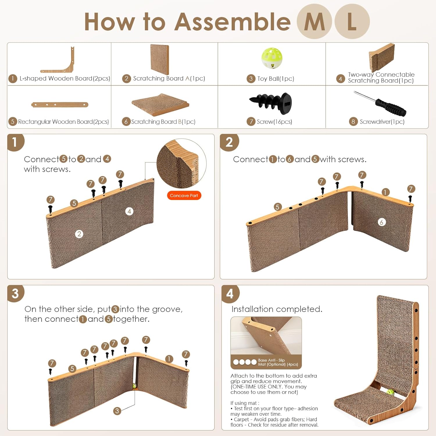 • ЛЕСЕН МОНТАЖ Нашата дъска за драскане за котки е лесна за монтаж и е снабдена с инструкции и необходимите инструменти. Предоставяме и видеоклип за монтаж, за да можете да я инсталирате бързо и лесно.