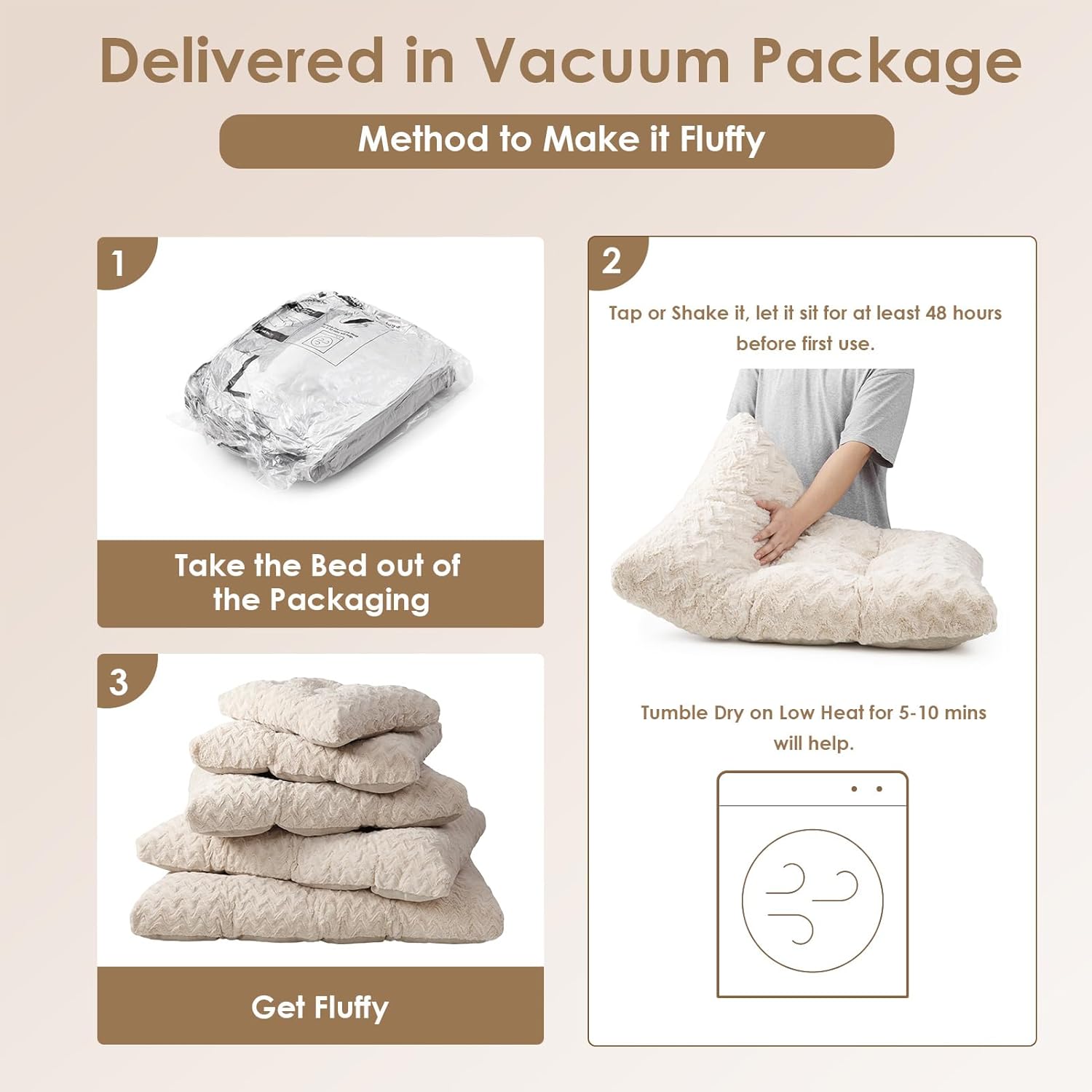 • Важна забележка: Постелката за кучета е вакуумно опакована. Преди да я използва кучето ви, моля, изтръскайте постелката или я оставете за 24-48 часа, за да възвърне пълната си пухкавост.