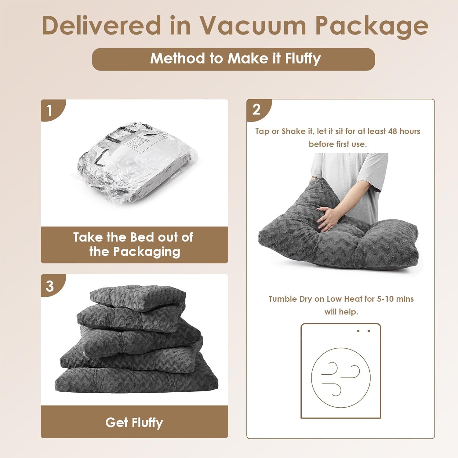 • Важна забележка: Постелката за кучета е вакуумно опакована. Преди да я използва кучето ви, моля, изтръскайте постелката или я оставете за 24-48 часа, за да възвърне пълната си пухкавост.