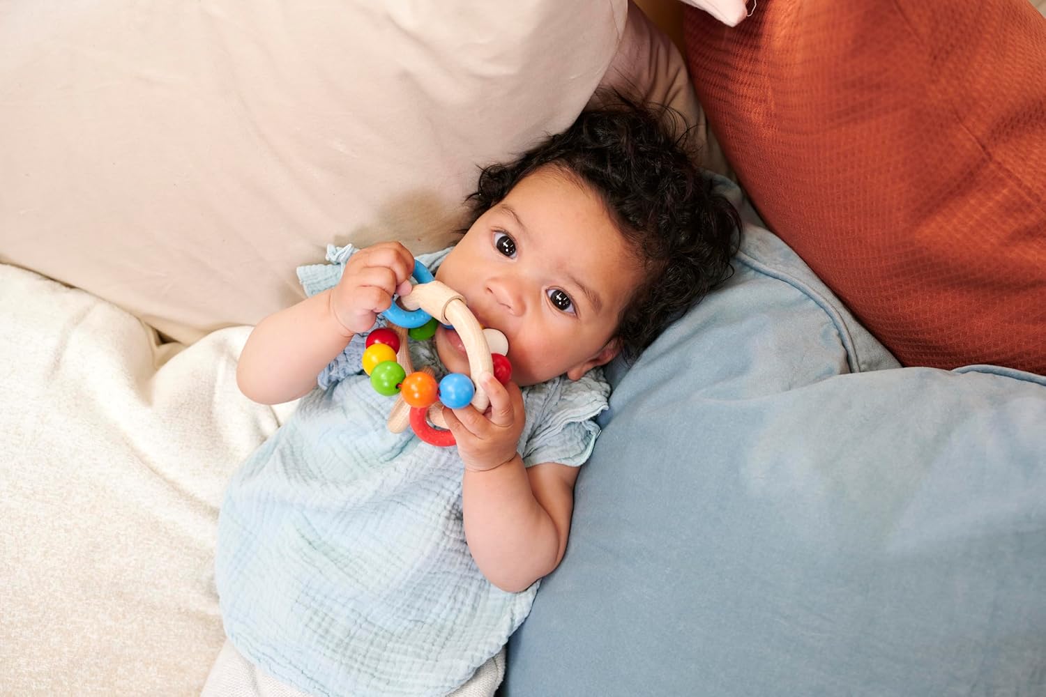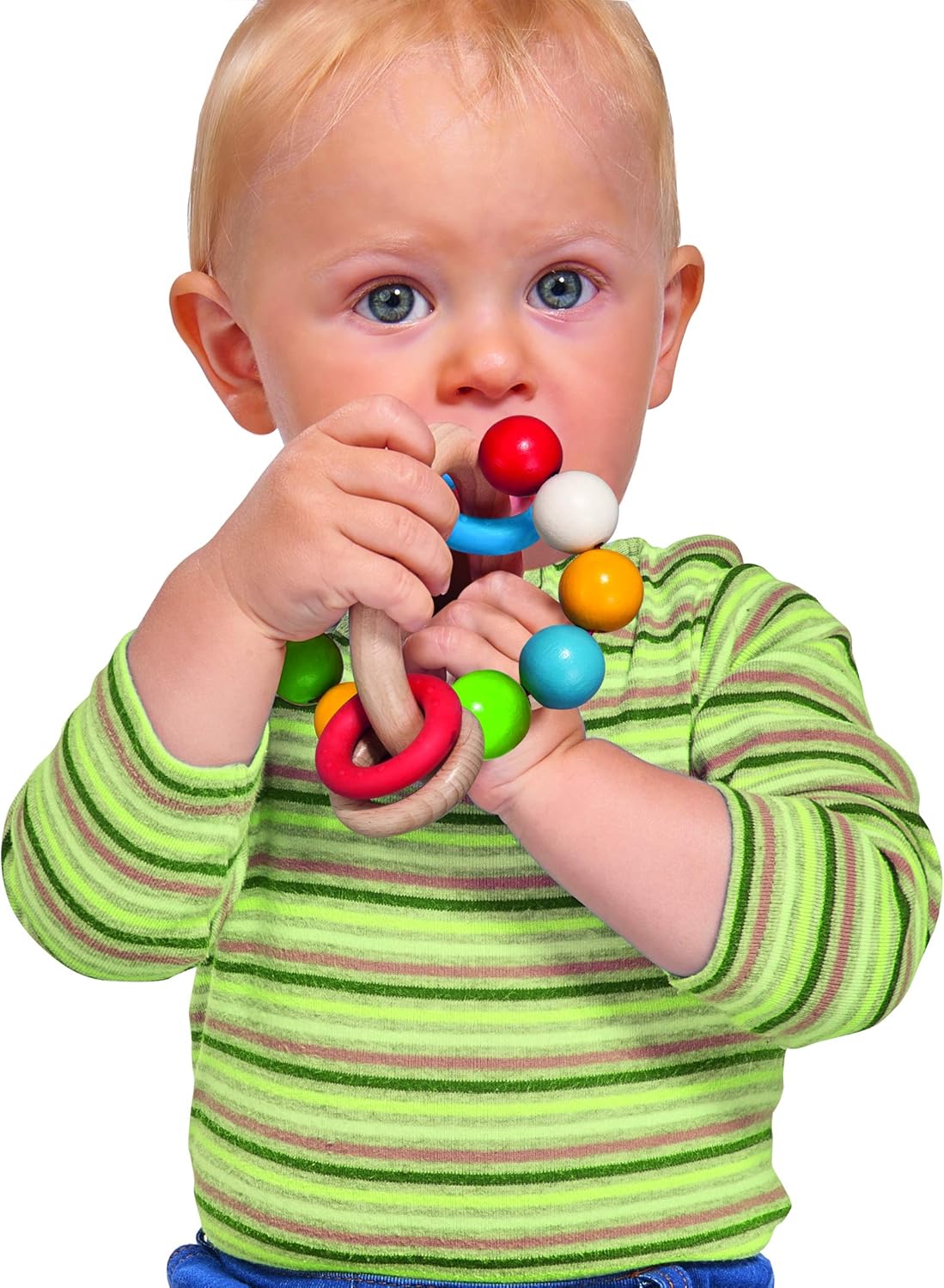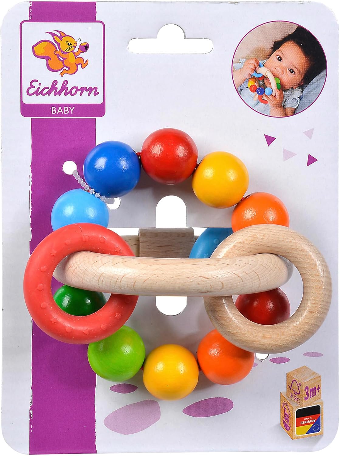 Цветната 3D гризалка за зъби на Eichhorn е перфектната играчка за бебета. Петте преплетени пръстена осигуряват нови сензорни преживявания за малките и игриво стимулират множество сетива. Различните цветове и гъвкавите и твърди текстури на пръстените събуждат естествените инстинкти на детето, като едновременно с това подобряват зрителното възприятие, фината моторика и чувствителността към звук.