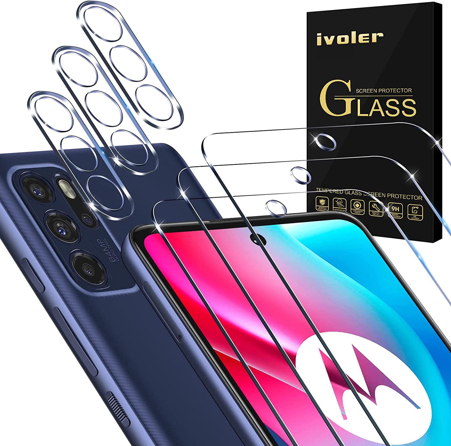Екранен протектор iVoler, За Motorola Moto G60s, 9H твърдост, Защита от надрасквания, 3 броя + 3x протектор за камера