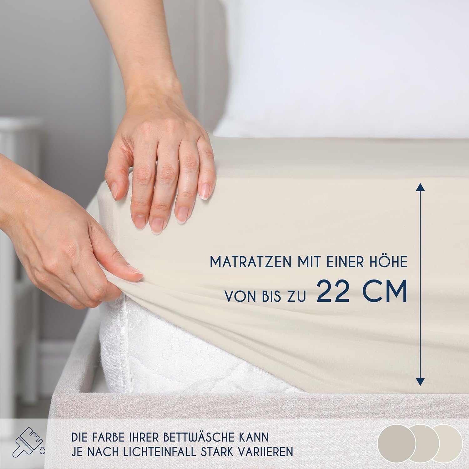 • Подправете матрака си – проектирайте спалното си бельо с този чаршаф от джърси памук за възрастни в бежово (100% джърси памук и 130 г/м²), лек, дишащ и много издръжлив материал: ще ви хареса да се пъхнете под одеялото. 200 x 200 см се отнася за размера на матрака, размерите на чаршафа може да варират с няколко сантиметра, за да паснат по-добре на възглавницата.