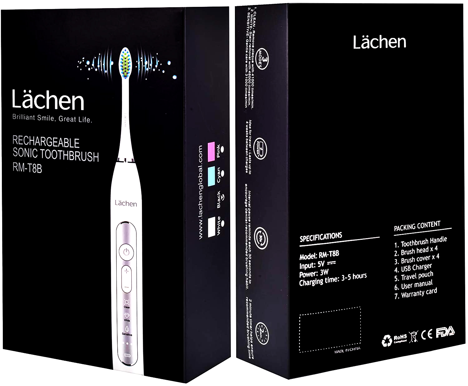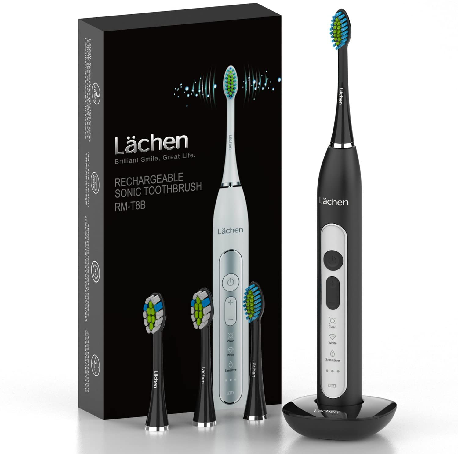 Електрическа четка за зъби Lächen RM-T8B, 3 режима, Таймер, 2 вида глави, 3W, До 4 седмици с едно зареждане, Черна