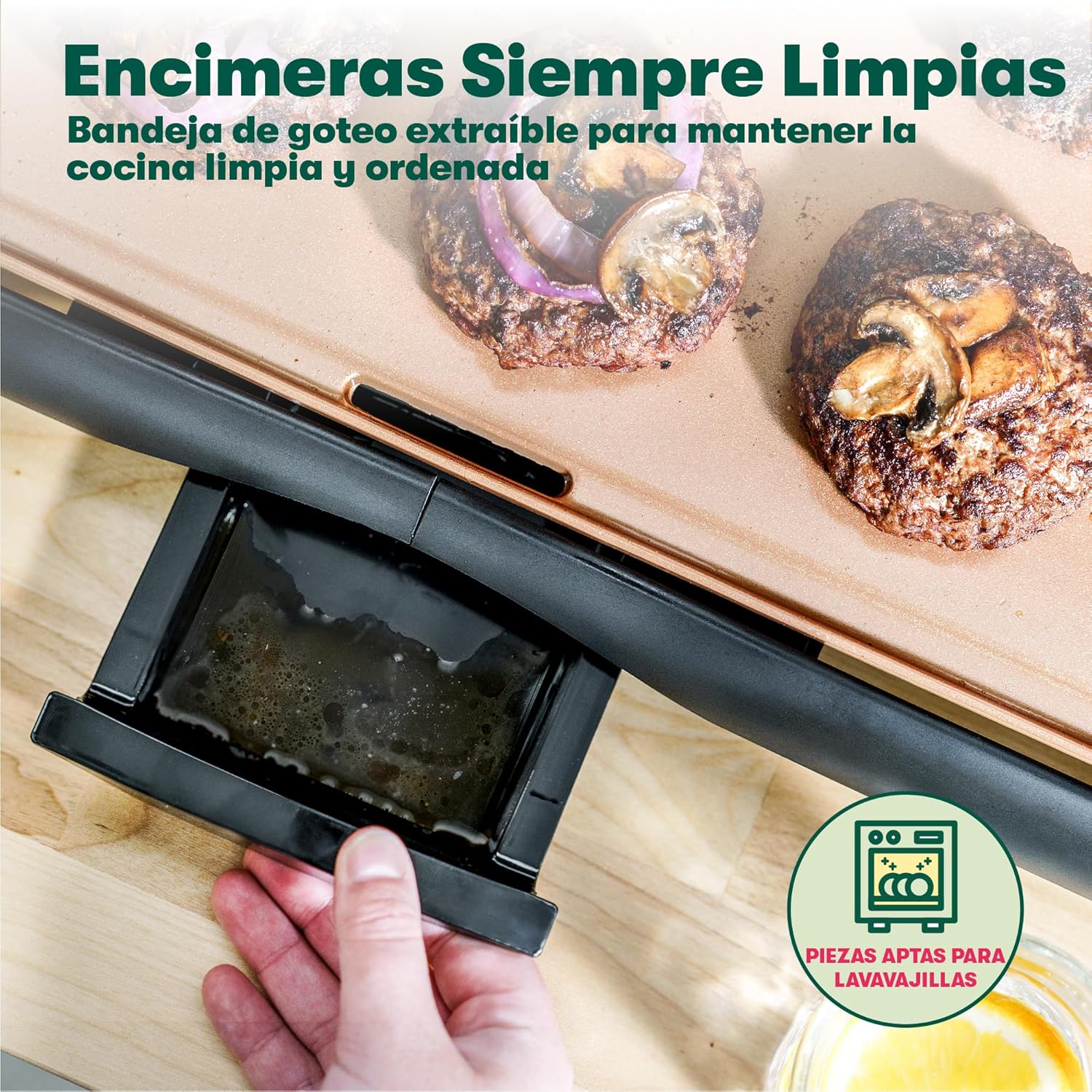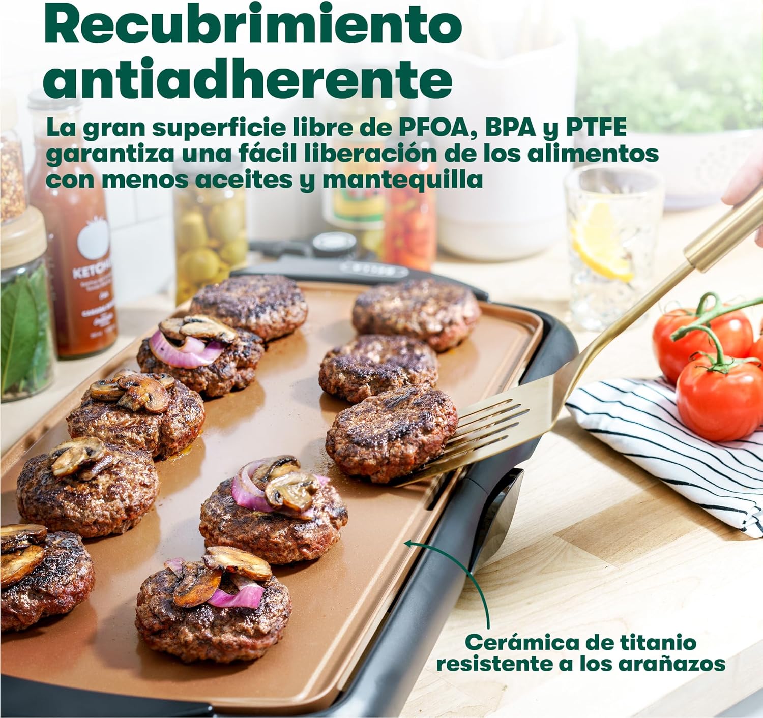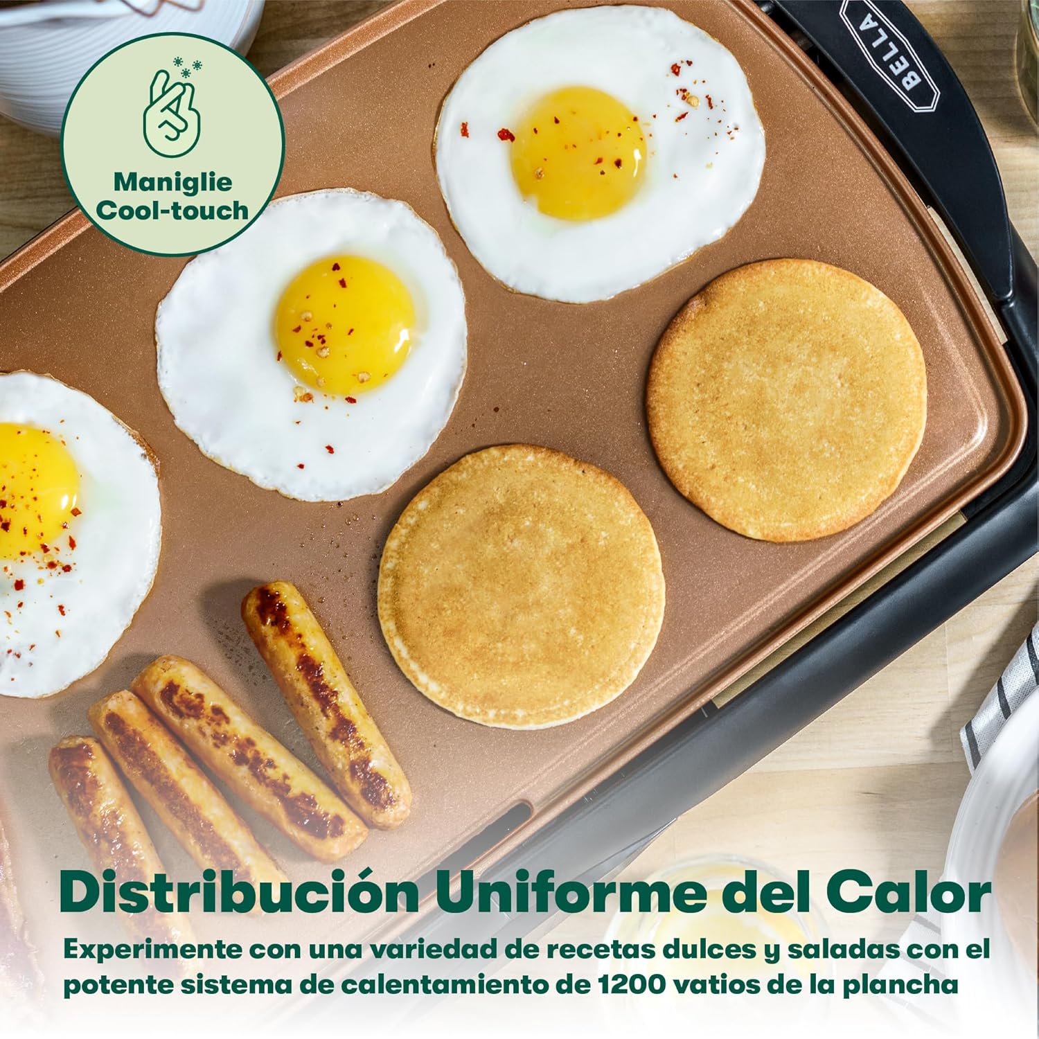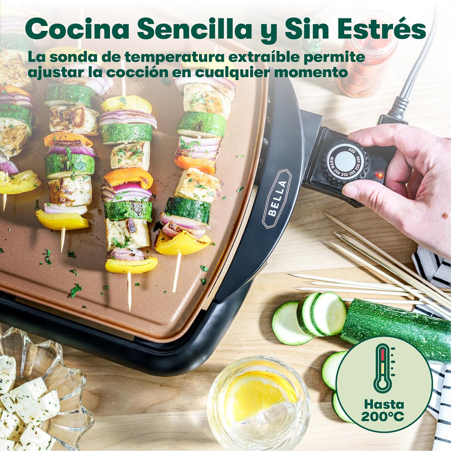 Електрическа керамична титаниева плоча за готвене bella, незалепващо покритие, голяма потопяема повърхност за готвене и подвижна тава за мазнини, регулируема температура, без PTFE и PFOA, 27 см x 51 см, мед